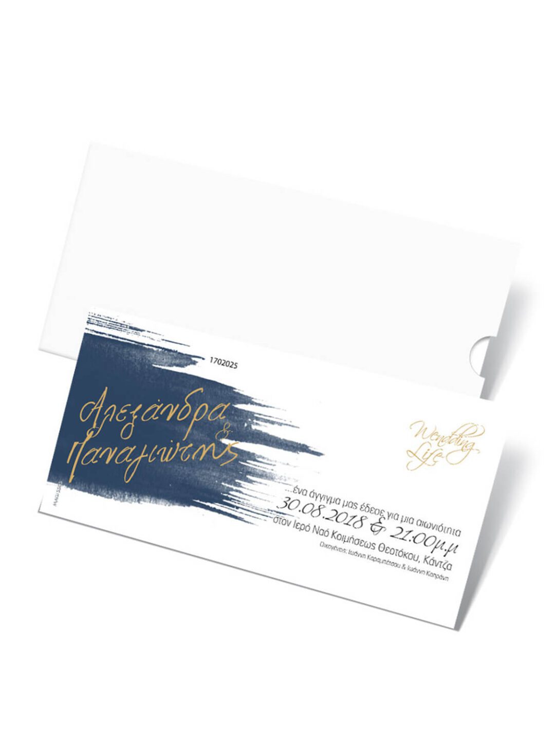 Προσκλητήριο γάμου οριζόντιο από μεταλιζέ σαγρέ χαρτόνι σε off white, με πινελιά σε μπλέ nave με μαύρα και χρυσά γραμματα. Αποτελείται από κατακόρυφο, συρταρωτό off white μεταλιζέ σαγρέ φάκελο με διαστάσεις 9×20 cm.Τα χρώματα εκτύπωσης και τα γραφικά, μπορούν να τροποποιηθούν κατ επιλογή του πελάτη.