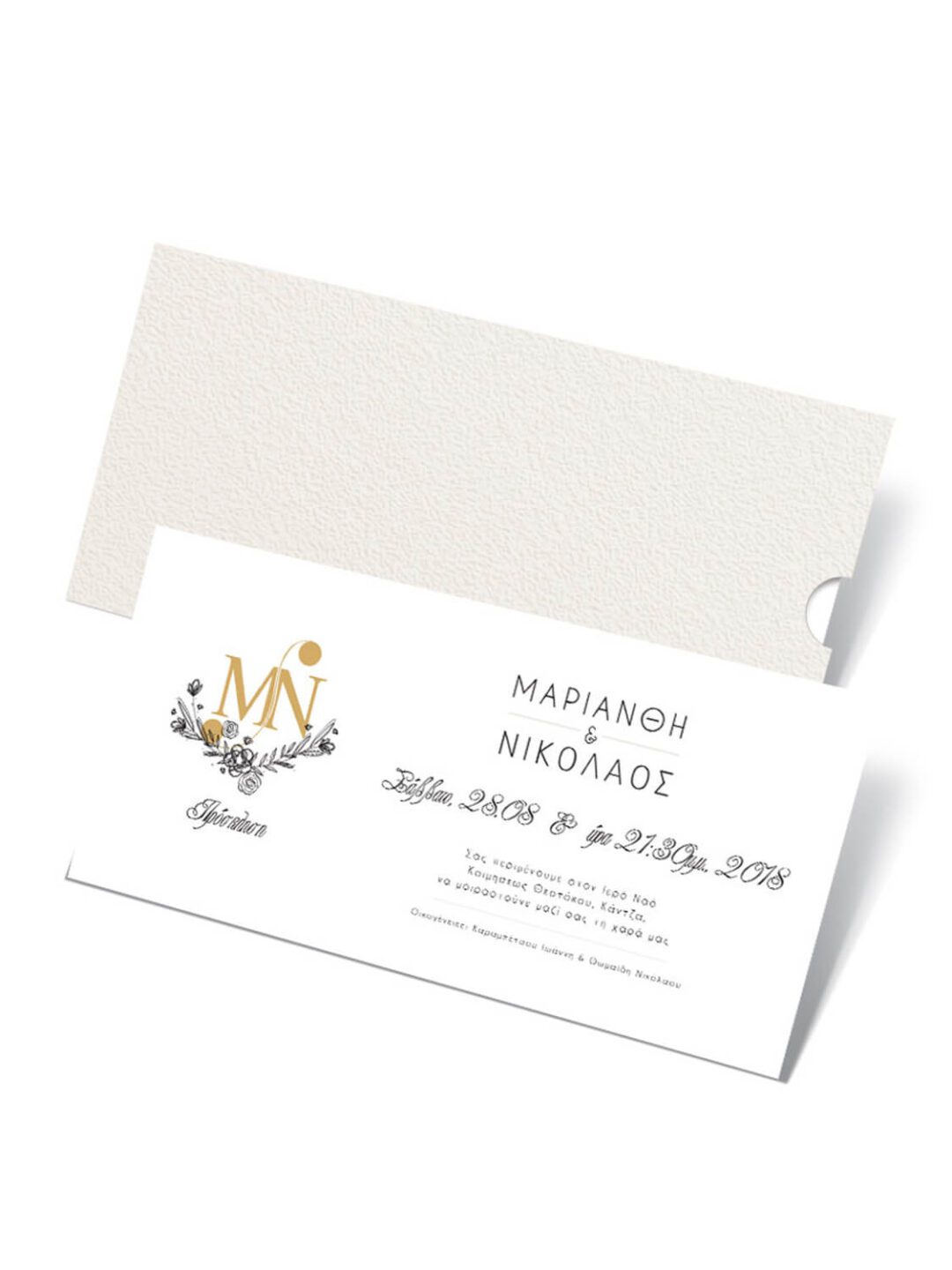Προσκλητήριο γάμου οριζόντιο, διπλής όψης, από χαρτόνι σε μπεζ χρυσό χρώμα, με την μία όψη, τα αρχικά από τα ονόματα και στεφάνι στην μέση και η άλλη όψη, τα αρχικά σε έντονο χρυσό χρώμα, και ονόματα, ημερομηνία με μαύρα καλλιγραφικά γράμματα. Αποτελείται από οριζόντιο φάκελο συρταρωτό από χαρτόνι, σε μεταλιζέ μπεζ χρυσό χρώμα, διαστάσεις 9×20 cm. Τα χρώματα εκτύπωσης και τα γραφικά, μπορούν να τροποποιηθούν κατ επιλογή του πελάτη.