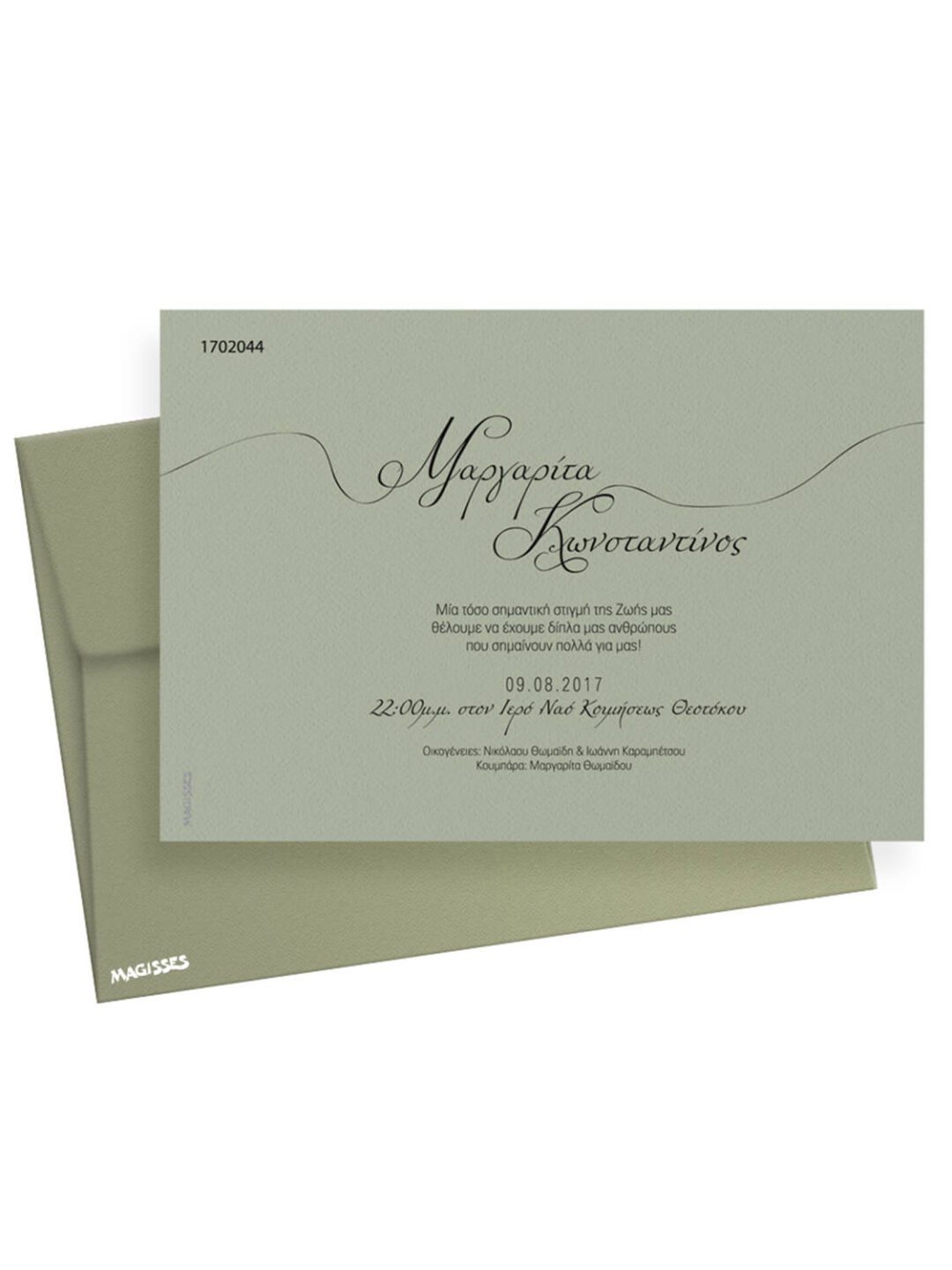 Προσκλητήριο γάμου τετράγωνο από χαρτόνι σε χρώμα χακί. Ένα απλό ιδιαίτερο, λιτό προσκλητήριο με καλλιγραφικά γράμματα. Αποτελείται από φάκελο σε χρώμα λαδί, από χαρτόνι σε διαστάσεις 18×12,5 cm. Τα χρώματα εκτύπωσης και τα γραφικά, μπορούν να τροποποιηθούν κατ επιλογή του πελάτη.