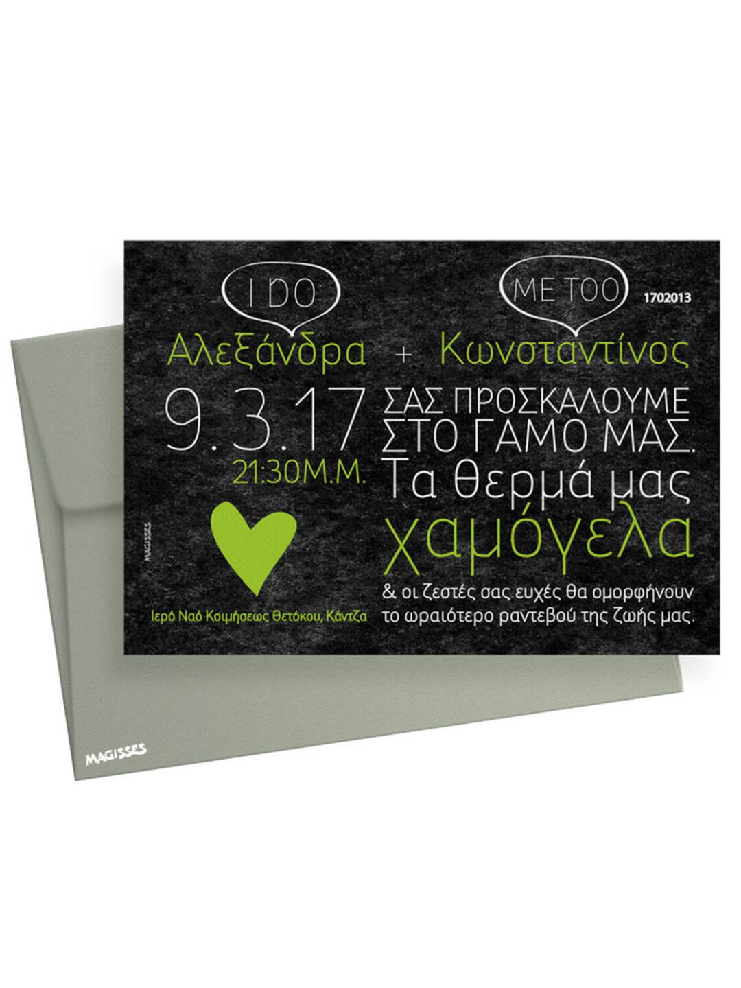 Προσκλητήριο γάμου τετράγωνο σε μαύρο γυαλιστερό χαρτόνι με μεγάλα μαύρα/πράσινα γράμματα με θέμα την καρδιά. Αποτελείται από φάκελο σε χρώμα χακί, από χαρτόνι σε διαστάσεις 18×12,5 cm.Τα χρώματα εκτύπωσης και τα γραφικά, μπορούν να τροποποιηθούν κατ επιλογή του πελάτη.