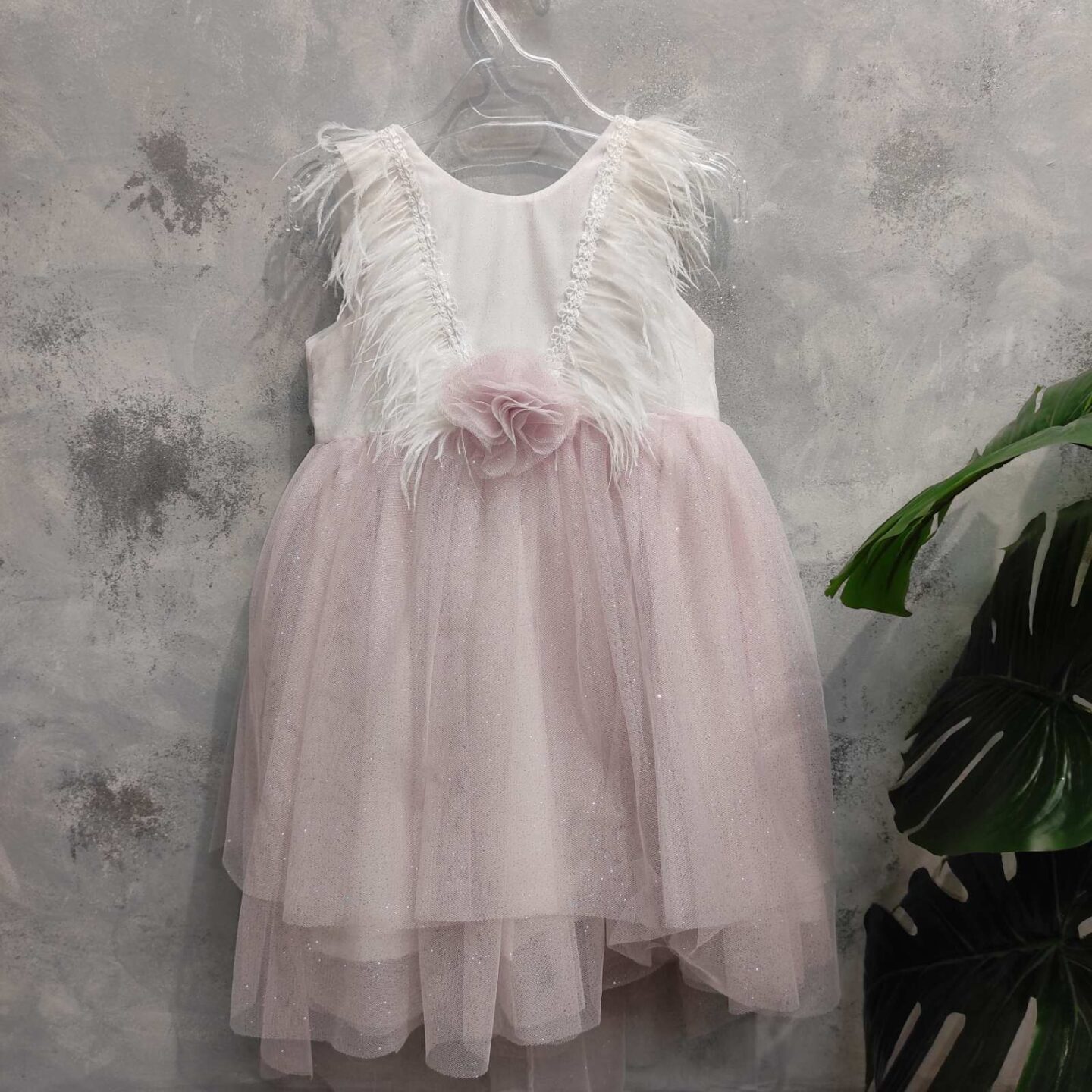 Ρομαντικό βαπτιστικό φόρεμα με γκλίτερ και τούλι σε λευκή και ροζ απόχρωση.Το φόρεμα έχει εντυπωσιακό σχέδιο με φτερά . Καλύπτει εως 24 μηνών.