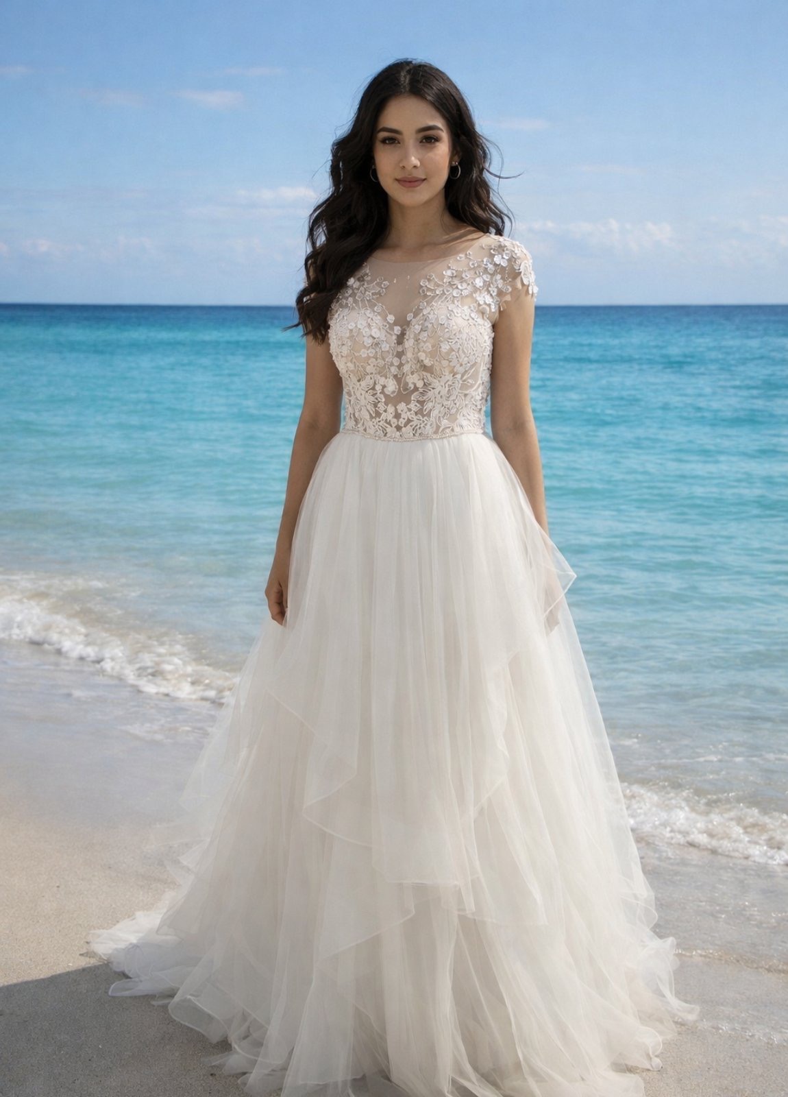Ρομαντικό και διαχρονικό νυφικό που αποπνέει κομψότητα και φίνα θηλυκότητα. Το ημιδιάφανο μπούστο είναι διακοσμημένο με πλούσια, λεπτοδουλεμένη δαντέλα και ανάγλυφα floral μοτίβα, δημιουργώντας ένα elegant αποτέλεσμα που αγκαλιάζει το σώμα με φυσικό τρόπο. Το απαλό illusion ντεκολτέ προσφέρει στήριξη και κομψότητα, χωρίς να βαραίνει το σύνολο. Η φούστα από ανάλαφρο τούλι πέφτει ομοιόμορφα, χαρίζοντας αίσθηση ροής και άνεσης, ιδανική για νύφες που αναζητούν ρομαντική αισθητική με διακριτική πολυτέλεια. Η γραμμή του φορέματος κολακεύει τη σιλουέτα και ταιριάζει απόλυτα τόσο σε κλασικό όσο και σε boho ή ρομαντικό γάμο. Ένα νυφικό ιδανικό για νύφες που αγαπούν την λεπτομέρεια, την απλότητα και την διαχρονική ομορφιά.