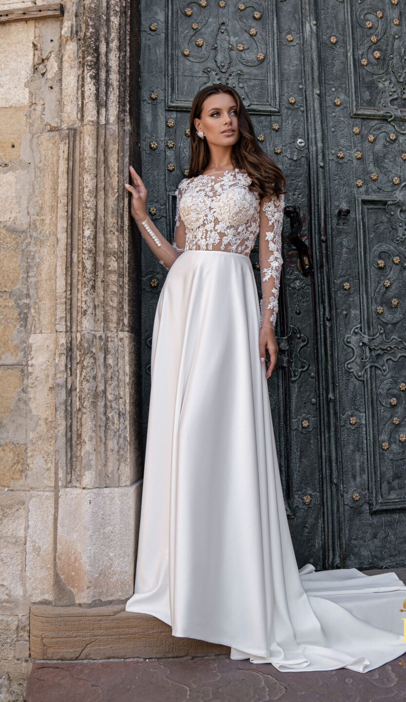 Ρομαντικό νυφικό με αποσπώμενο ολόσωμο τούλι .Στο επάνω μέρος έχει διαφάνεια με κεντητά εντυπωσιακά σχέδια.Στην πλάτη κάνει V. Διαθέτει αποσπώμενο ολόσωμο τούλι με ουρά που δίνει στο νυφικό μια ρομαντική διάθεση. Ιδανικό για πολιτικό και θρησκευτικό γάμο. Κανονική εφαρμογή