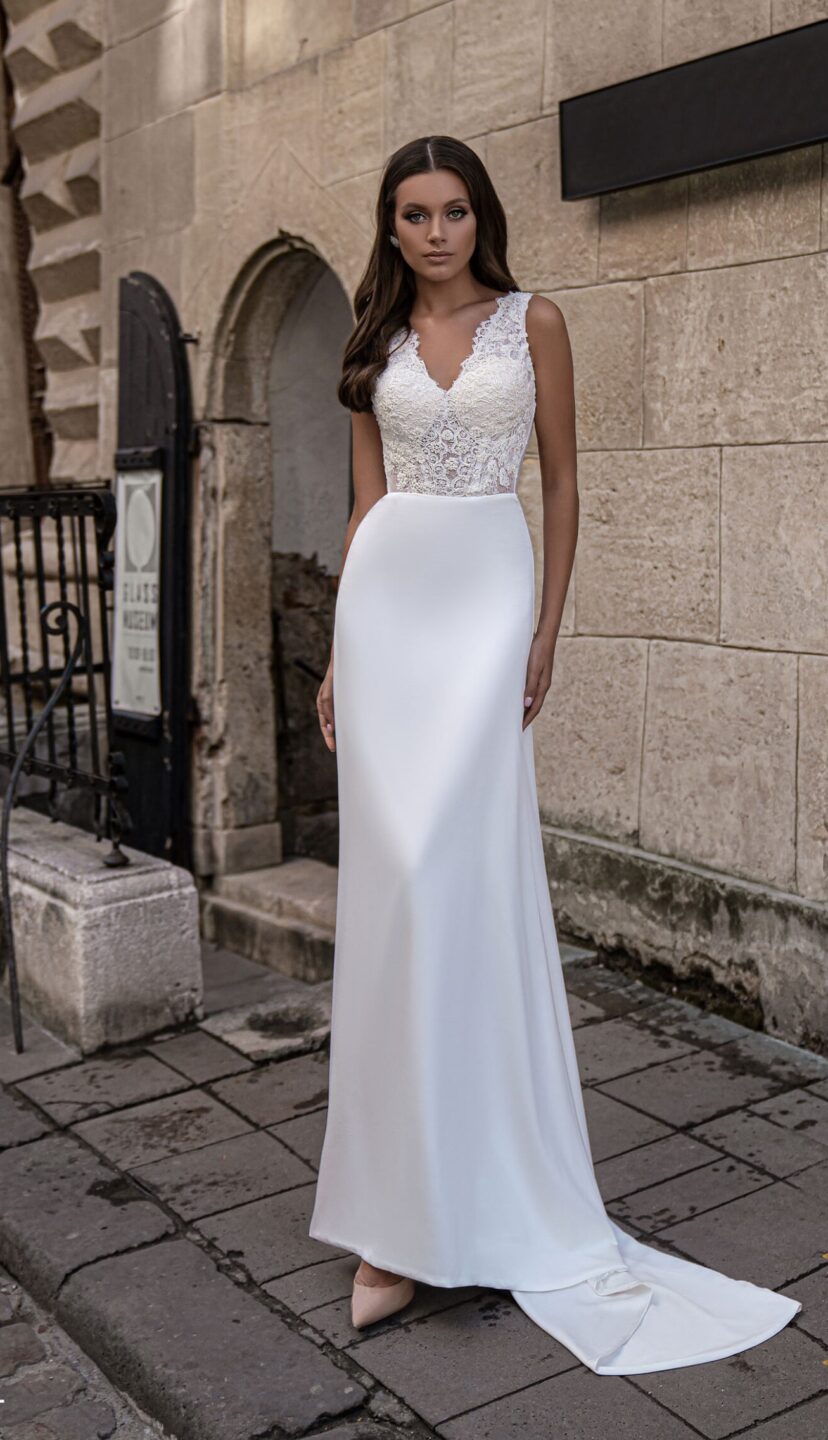 Ρομαντικό νυφικό με αποσπώμενο τούλι με μανίκια. Στο επάνω μέρος είναι κεντητό και κάνει V. Διαθέτει αποσπώμενο ολόσωμο τούλι με μανίκια που δίνει στο νυφικό ρομαντική διάθεση. Ιδανικό για πολιτικό και θρησκευτικό γάμο. Κανονική εφαρμογή