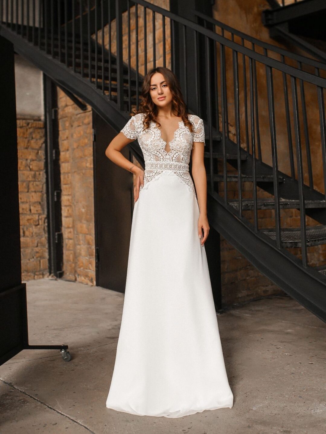 Ρομαντικό νυφικό με δαντέλα. Διαθέτει δαντέλα στο επάνω μέρος. Βαθύ μπούστο V και ανοιχτή πλάτη.