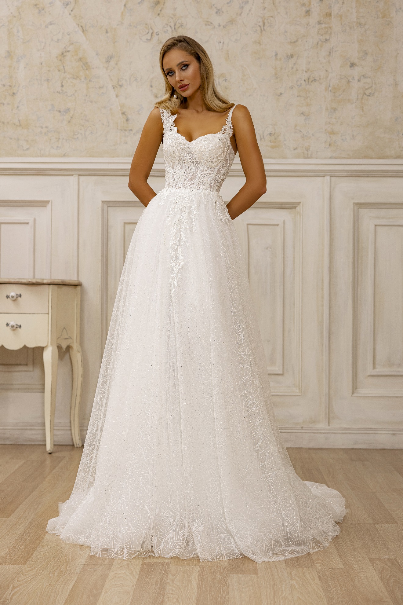 Ρομαντικό νυφικό με κορσέ και ουρά. Διαθέτει ιδιαίτερα διαφορετικά τιραντάκια και είναι εμπλουτισμένο με υπέροχα χειροποίητα κεντήματα