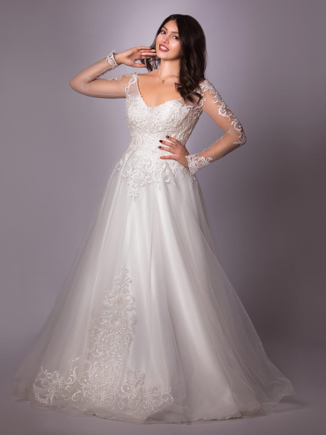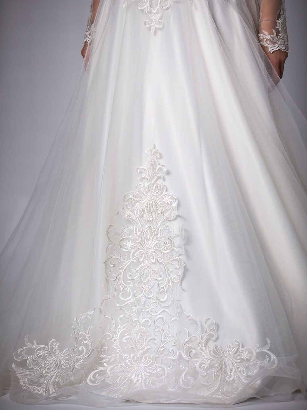 Ρομαντικό νυφικό σε άλφα γραμμή από Γαλλικό τούλι με απλικαρισμένη κεντημένη Γαλλική δαντέλα με διάφανο μανίκι από τούλι κεντημένο από δαντέλα. Με εντυπωσιακή πλάτη σε V τελείωμα και κεντημένη διακριτική ουρά. Λεπτομέρειες από κουμπιά πέρλες στο τελείωμα του. Πολλές νύφες μας μας έχουν εμπιστευτεί και έχουν αγοράσει με τις συμβουλές μας το νυφικό τους online. Αν δεν είσαι σίγουρη για την εφαργαγή του μπορείς να κλείσεις ραντεβού για πρόβα στο info@missvanity.gr για να επισκεφτείς το φυσικό μας κατάστημα και κέρδισε 10% έκπτωση.