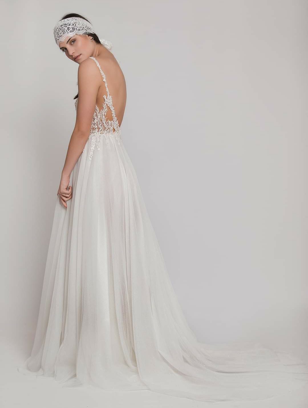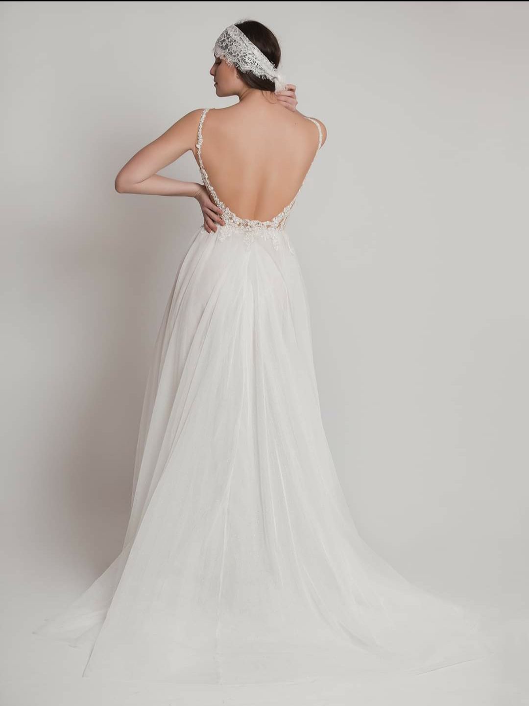 Ρομαντικό νυφικό σε Άλφα γραμμή, με φούστα από μεταξωτό τούλι και απλικαρισμένη γαλλική δαντέλα στη μέση. Εντυπωσιακό δαντελένιο μπούστο με βαθύ άνοιγμα στο ντεκολντέ. Λεπτή δαντελένια τιράντα και ανοιχτή όλη η πλάτη. Ελληνικής ραφής.