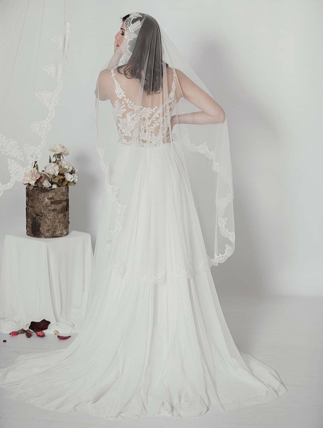 Ρομαντικό νυφικό σε Άλφα γραμμή, με φούστα από μεταξωτό τούλι και ουρά. Εντυπωσιακό μπούστο με απλικαρισμένη γαλλική δαντέλα. Χαμηλή πλάτη όλο δαντέλα, λεπτή δαντελένια τιράντα. Ελληνικής ραφής.