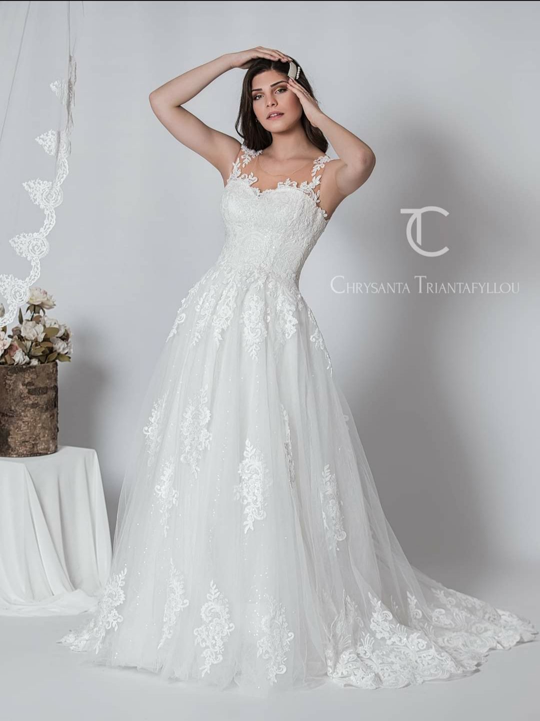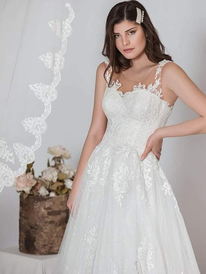 Ρομαντικό νυφικό σε Άλφα γραμμή, με φούστα από μεταξωτό τούλι και απλικαρισμένη γαλλική δαντέλα. Εντυπωσιακό δαντελένιο μπούστο στράπλες αλλά με διαφάνεια μέχρι τον ώμο που το κάνει σταθερό. Στην τιράντα έχει απλικαρισμένη γαλλική δαντέλα. Κανονική πλάτη όλο δαντέλα. Ελληνικής ραφής.