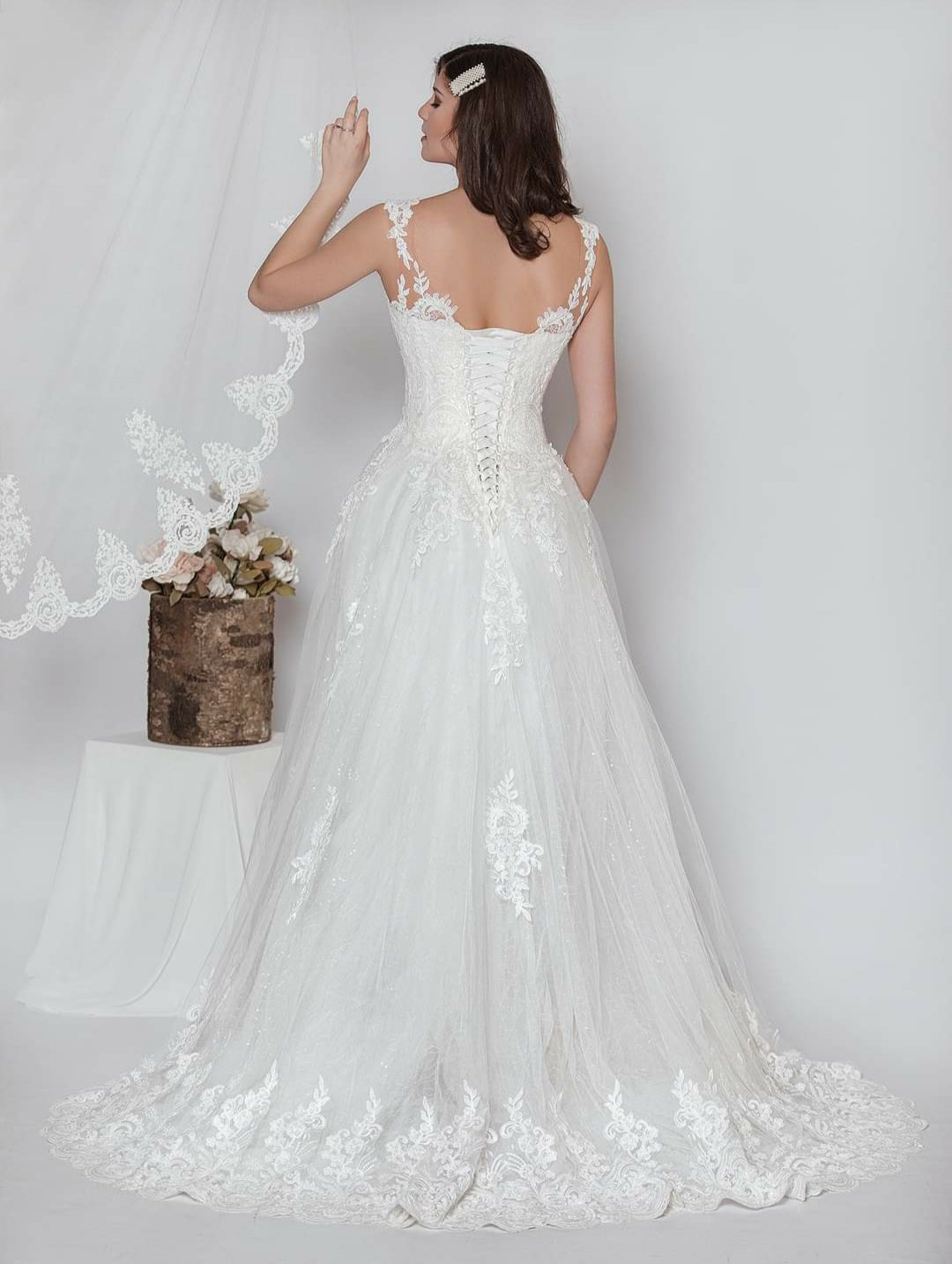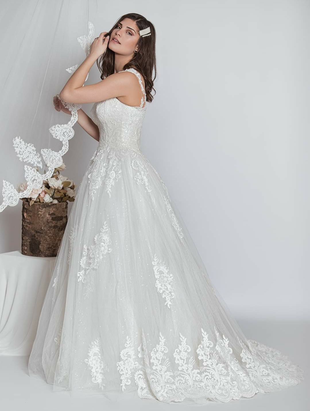 Ρομαντικό νυφικό σε Άλφα γραμμή, με φούστα από μεταξωτό τούλι και απλικαρισμένη γαλλική δαντέλα. Εντυπωσιακό δαντελένιο μπούστο στράπλες αλλά με διαφάνεια μέχρι τον ώμο που το κάνει σταθερό. Στην τιράντα έχει απλικαρισμένη γαλλική δαντέλα. Κανονική πλάτη όλο δαντέλα.