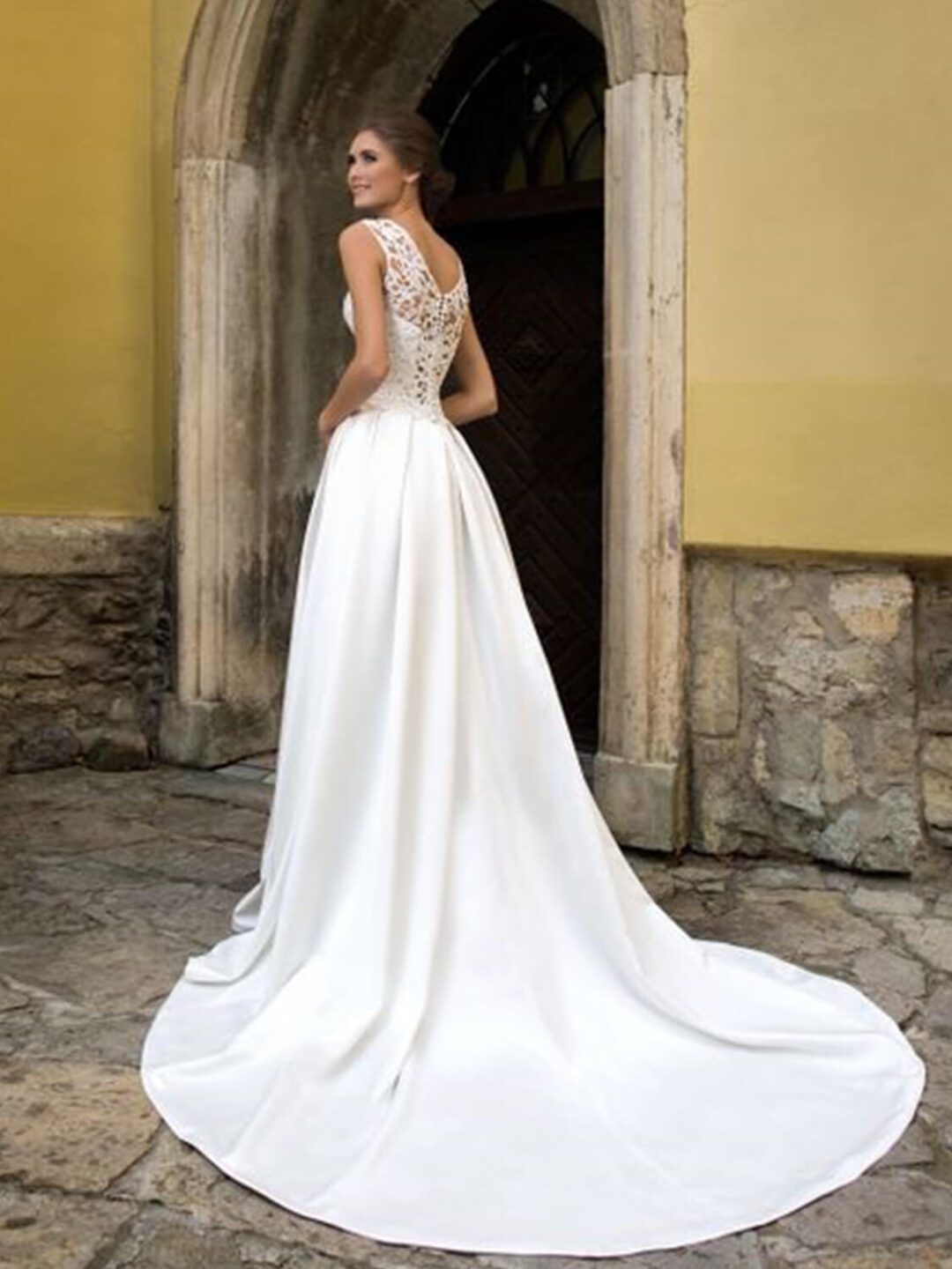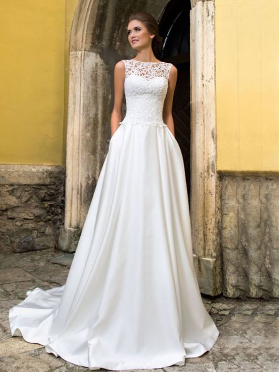 Ρομαντικό νυφικό σε Άλφα γραμμή με ολόκληρο μπούστο δαντέλα και πλούσια φούστα από γαλλικό σατέν. Εντυπωσιακή ουρά