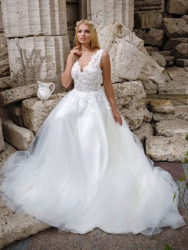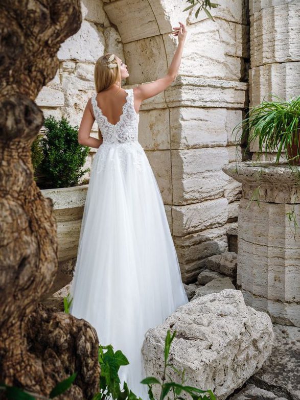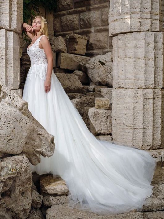 Ρομαντικό νυφικό σε Άλφα γραμμή, με φούστα από γαλλικό τούλι και κεντημένη δαντέλα κάτω από τη μέση. Με υπέροχο ολοκέντητο μπούστο με γαλλική δαντέλα που καταλήγει σε βαθύ V στην πλάτη και το μπούστο. Άνετη γραμμή. Ελληνικής ραφής