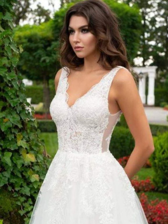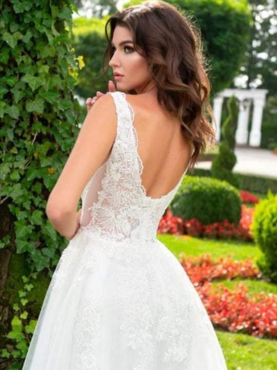 Ρομαντικό νυφικό σε Άλφα γραμμή με μπούστο κεντημένο με υπέροχη γαλλική δαντέλα και φούστα από γαλλικό τούλι, διακοσμημένη με δαντέλα κάτω από τη μέση. Μπούστο V, ραντάκι από δαντέλα και ανοιχτή πλάτη. Ελληνικής ραφής