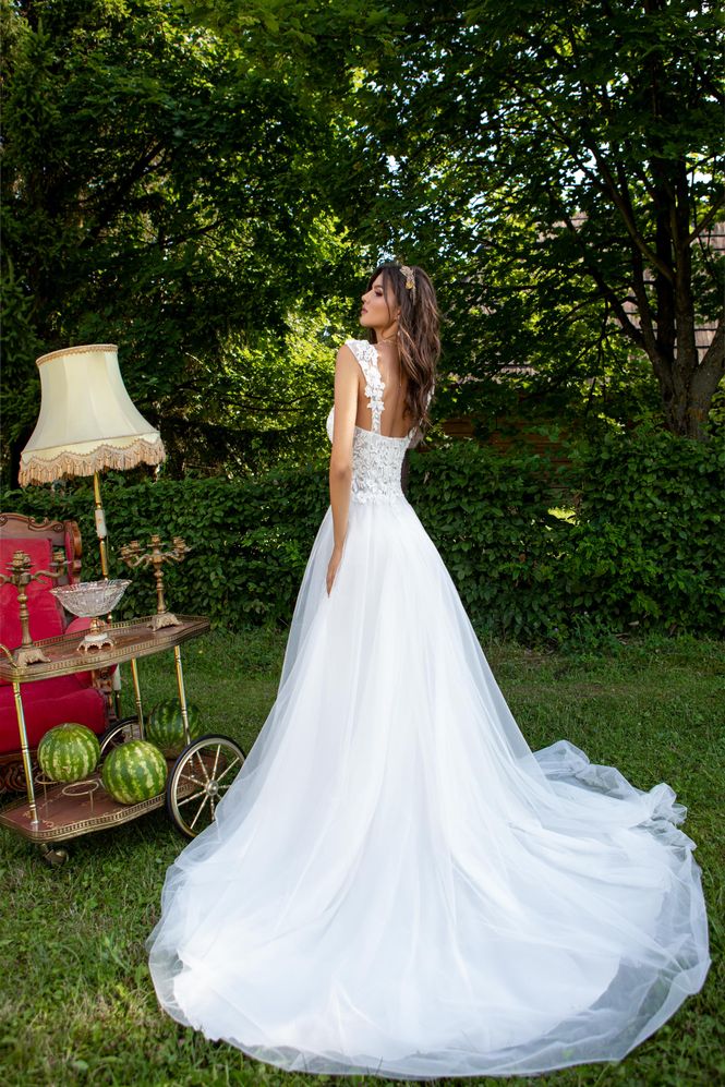 Ρομαντικό Nυφικό με μπούστο καρδιά κεντημένο με γαλλική δαντέλα και τιράντα δαντέλα, κανονική πλάτη. Φούστα από γαλλικό τούλι σε Α γραμμή, διακοσμημένη με δαντέλα στη μέση. Κανονική εφαρμογή
