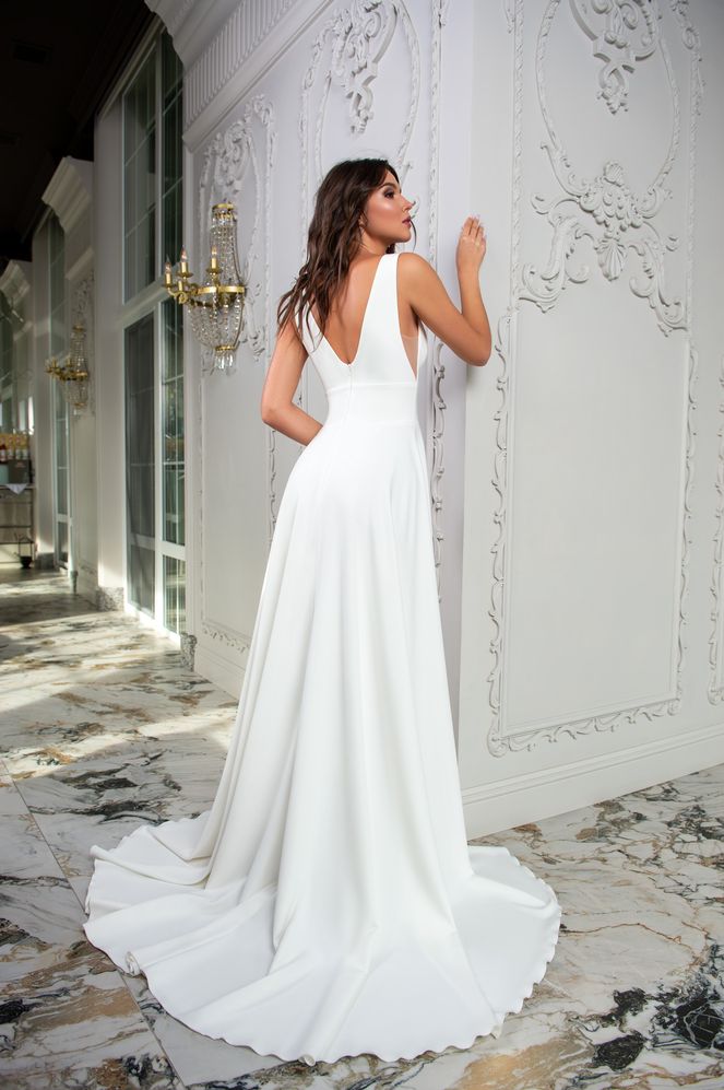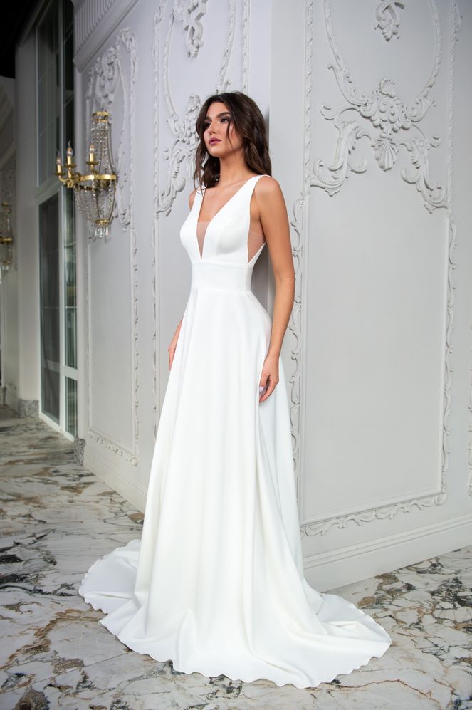 Σίκ νυφικό με διαφάνεια. Έχει βαθύ μπούστο V με διαφάνεια και ανοιχτή πλάτη.