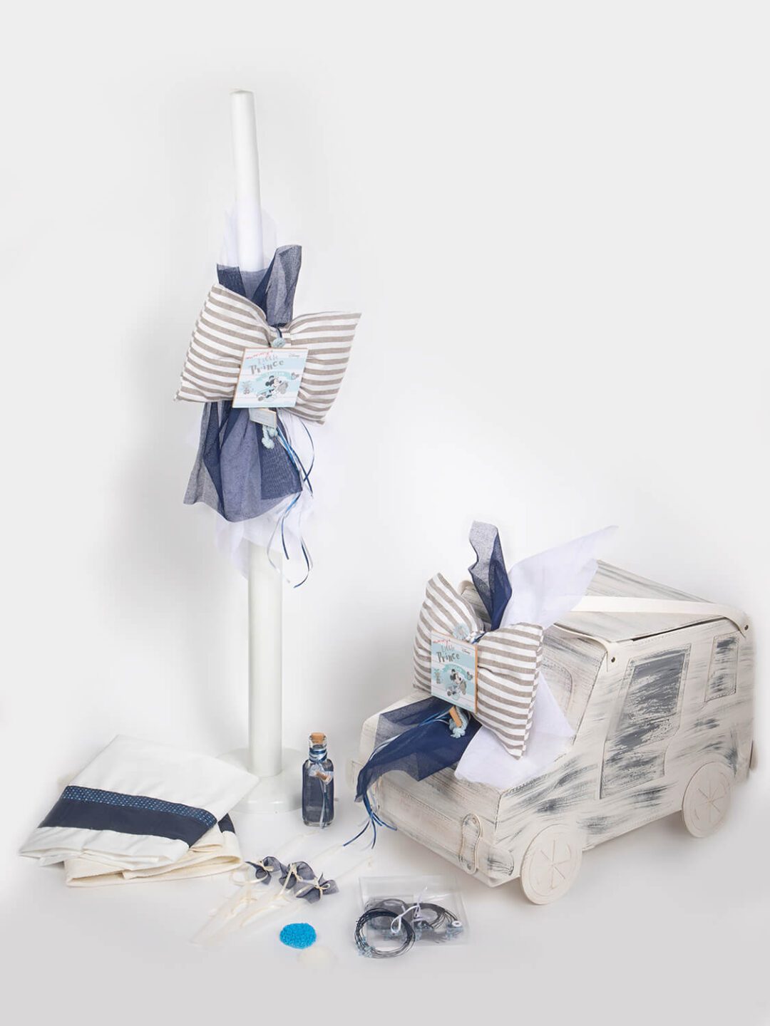 Σετ βάπτισης με Βαλίτσα δερμάτινη σε σχήμα τζιπάκι παλαιωμένο σε χρώμα off white αντικέ, ζωγραφισμένο στο χέρι με θέμα ο Mickey και διακοσμημένο με καδράκι Mickey φιόγκο, τούλια και κορδέλες. Το σετ περιλαμβάνει στολισμό λαμπάδας (δεν συμπεριλαμβάνεται το κερί), 50 μαρτυρικά, 3 κεράκια, μπουκάλι λαδιού, σαπουνάκι, πετσέτες, σετ λαδόπανα και εσώρουχα. *Tο σετ βάπτισης είναι χειροποίητο και χρειάζεται 10-12 ημέρες παράδοσης.