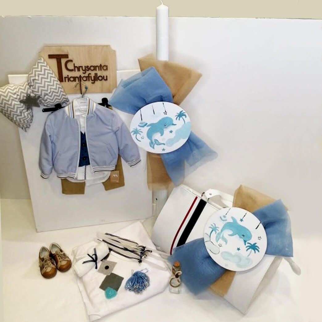 Σετ βάπτισης με άσπρη δερμάτινη βαλίτσα με διακόσμηση κόκκινη και μπλε κορδέλα και θέμα το Δελφίνι, συνδυασμένο με ρούχο. Το σετ περιλαμβάνει ρούχο, δερμάτινη βαλίτσα στολισμένη, στολισμό λαμπάδας (δεν συμπεριλαμβάνεται το κερί) με Δελφίνι ζωγραφισμένο στο χέρι, 50 μαρτυρικά, 3 κεράκια, μπουκαλάκι λαδιού, σαπουνάκια, πετσέτες, σετ λαδόπανα και εσώρουχα. Το σετ κουτί βάφτισης είναι χειροποίητο και ζωγραφισμένο στο χέρι και χρειάζεται 10-12 μέρες παράδοσης.