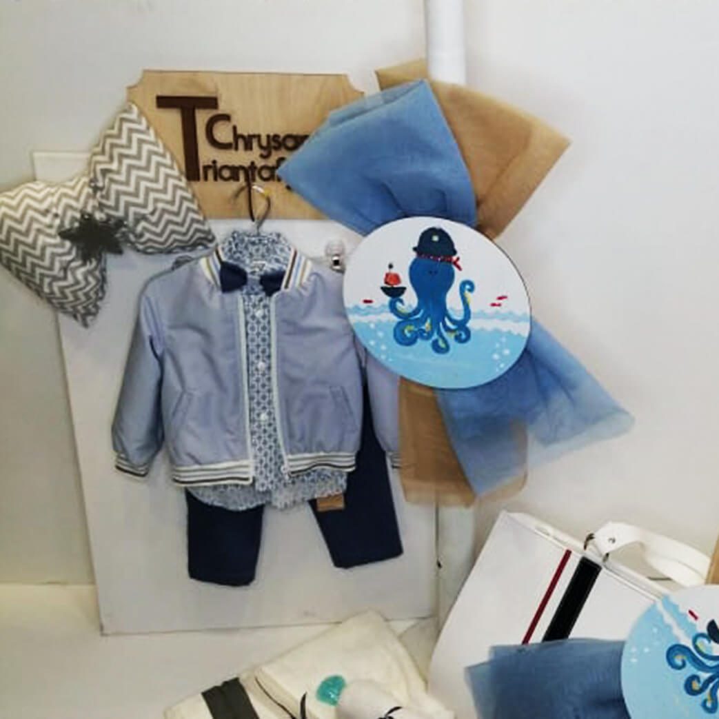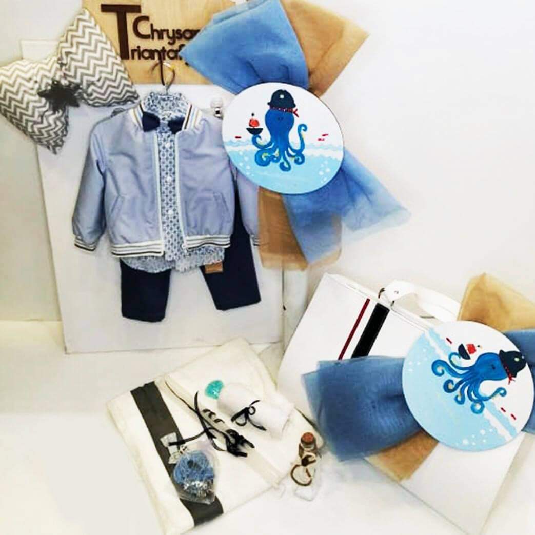 Σετ βάπτισης με άσπρη δερμάτινη βαλίτσα με διακόσμηση κόκκινη και μπλε κορδέλα και θέμα το Χταποδάκι, συνδυασμένο με ρούχο. Το σετ περιλαμβάνει ρούχο, δερμάτινη βαλίτσα στολισμένη, στολισμό λαμπάδας (δεν συμπεριλαμβάνεται το κερί) με Χταποδάκι ζωγραφισμένο στο χέρι, 50 μαρτυρικά, 3 κεράκια, μπουκαλάκι λαδιού, σαπουνάκια, πετσέτες, σετ λαδόπανα και εσώρουχα. Το σετ κουτί βάφτισης είναι χειροποίητο και ζωγραφισμένο στο χέρι και χρειάζεται 10-12 μέρες παράδοσης.