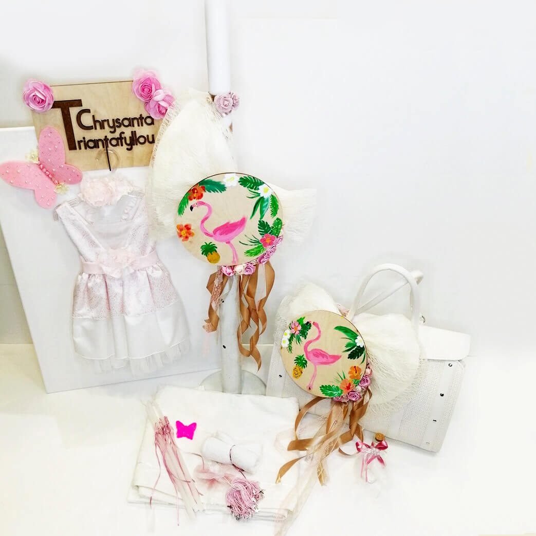Σετ βάπτισης με δερμάτινη βαλίτσα και θέμα το Flamingo, συνδυασμένο με φόρεμα. Το σετ περιλαμβάνει φόρεμα, δερμάτινη βαλίτσα στολισμένη, στολισμό λαμπάδας (δεν συμπεριλαμβάνεται το κερί) με Flamingo ζωγραφισμένο στο χέρι, 50 μαρτυρικά, 3 κεράκια, μπουκαλάκι λαδιού, σαπουνάκια, πετσέτες, σετ λαδόπανα και εσώρουχα. Το σετ κουτί βάφτισης είναι χειροποίητο και ζωγραφισμένο στο χέρι και χρειάζεται 10-12 μέρες παράδοσης.