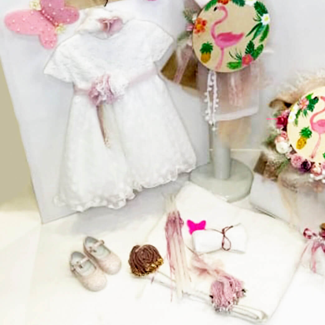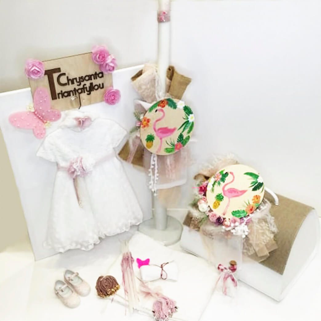 Σετ βάπτισης με άσπρη δερμάτινη βαλίτσα με διακόσμηση μπεζ λινάτσα και θέμα το Flamingo, συνδυασμένο με φόρεμα και παπουτσάκι. Το σετ περιλαμβάνει παπουτσάκι, φόρεμα, δερμάτινη βαλίτσα στολισμένη, στολισμό λαμπάδας (δεν συμπεριλαμβάνεται το κερί) με Flamingo ζωγραφισμένο στο χέρι, 50 μαρτυρικά, 3 κεράκια, μπουκαλάκι λαδιού, σαπουνάκια, πετσέτες, σετ λαδόπανα και εσώρουχα. Το σετ κουτί βάφτισης είναι χειροποίητο και ζωγραφισμένο στο χέρι και χρειάζεται 10-12 μέρες παράδοσης.