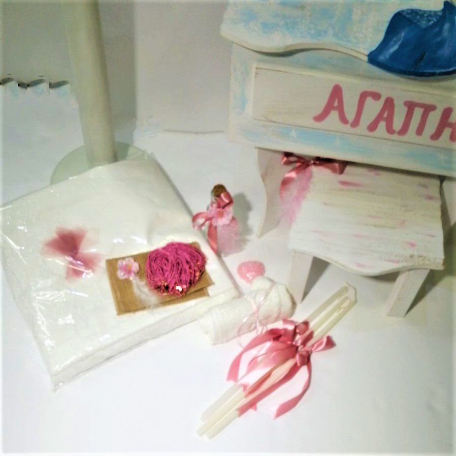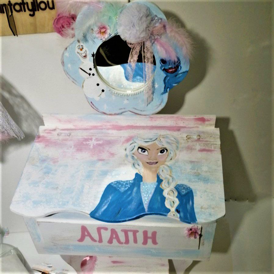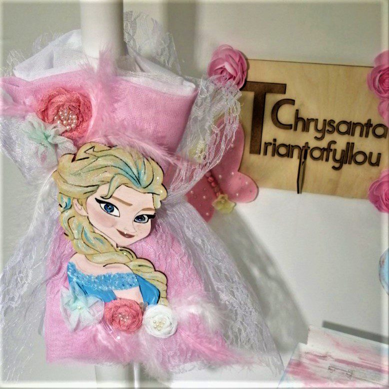 Σετ βάπτισης με θέμα την Έλσα από το Frozen, στις αποχρώσεις λευκό, ροζ και μπλε. Το σετ περιλαμβάνει διακόσμηση λαμπάδας (χωρίς το κερί), μπουντουάρ με σκαμπώ και καθρέφτη, διακοσμημένο με χειροποίητη ζωγραφιά, λουλουδάκια και δαντέλες, λαδόπανα, πετσέτες, εσώρουχα, 50 μαρτυρικά, 3 κεράκια, σαπουνάκια. Όλο το σετ είναι χειροποίητο και ζωγραφισμένο στο χέρι, χρειάζεται 10-12 μέρες παράδοσης. Δες εδώ το πλήρες σετ με φόρεμα και παπούτσι και επωφελήσου με 15% έκπτωση στο σύνολο!