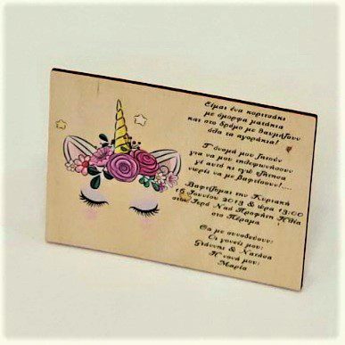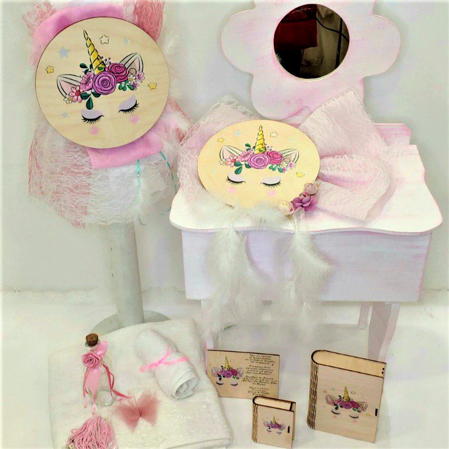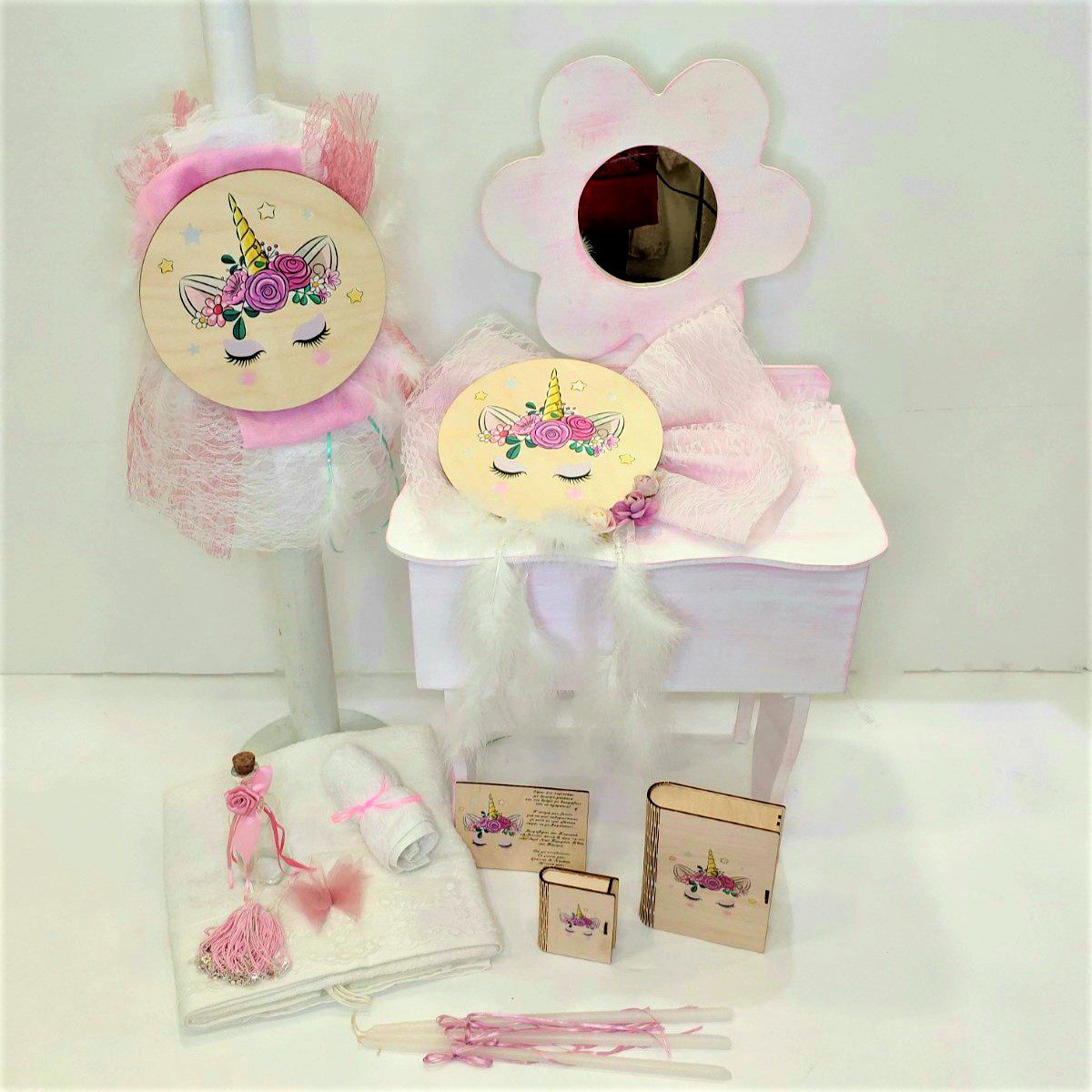 Σετ βάπτισης με μπουντουάρ και θέμα τον Μονόκερο – Unicorn. Το σετ περιλαμβάνει ξύλινο μπουντουάρ με σκαμπώ και καθρέφτη, σε off white παλαιωμένο στολισμένο, στολισμό λαμπάδας (δεν συμπεριλαμβάνεται το κερί) διακοσμημένα με τούλι, δαντέλα και στρογγυλό ξύλινο διακοσμητικό με το θέμα σε μεταξοτυπία, 50 μαρτυρικά, 3 κεράκια, μπουκαλάκι λαδιού, σαπουνάκια, πετσέτες, σετ λαδόπανα και εσώρουχα. Το σετ κουτί βάφτισης είναι χειροποίητο και χρειάζεται 10-12 μέρες παράδοσης.