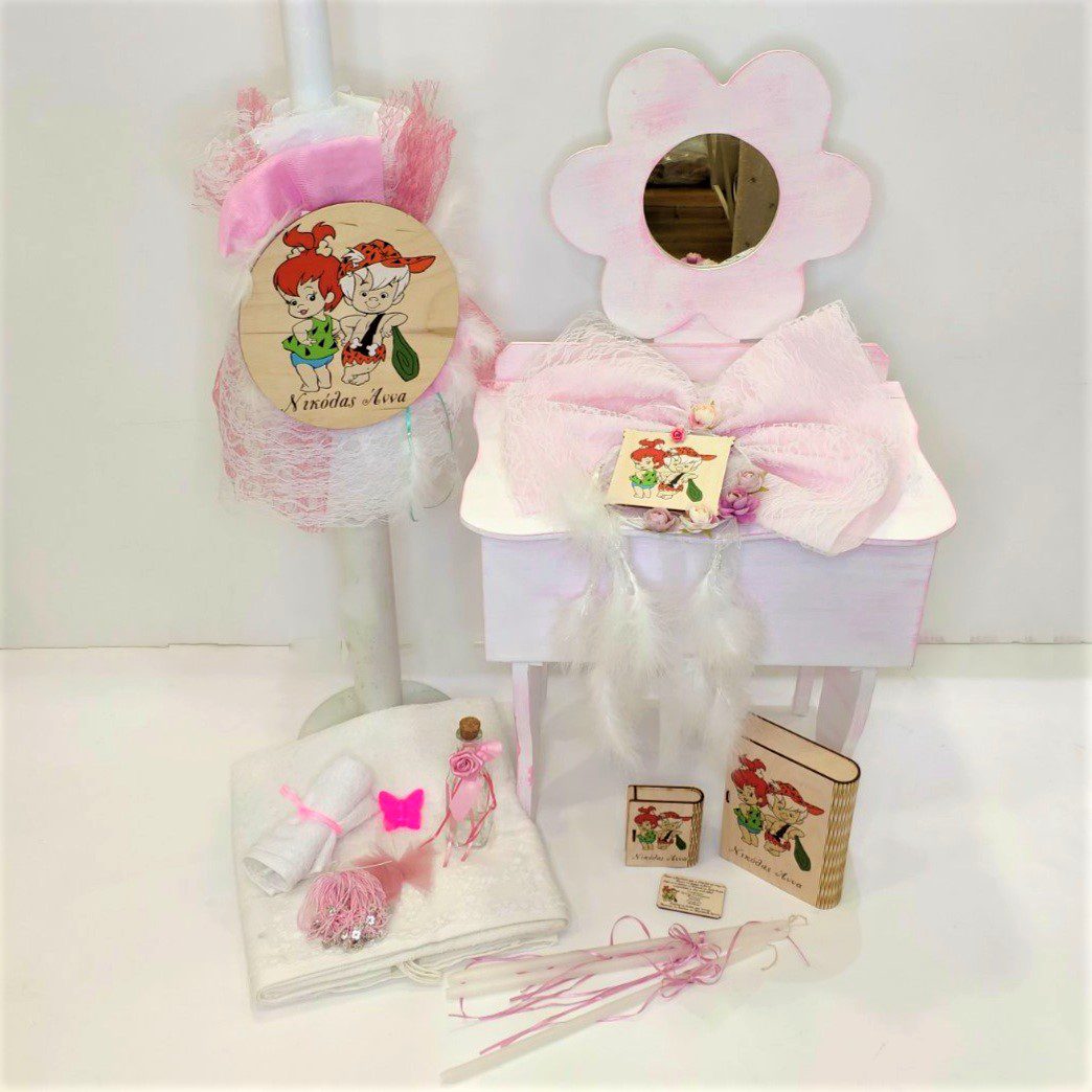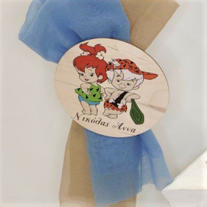 Σετ βάπτισης με ξύλινο αστέρι και θέμα τους Flintstones, ιδανικό για διδυμάκια αγόρι κορίτσι. Το σετ περιλαμβάνει ξύλινο αστέρι με αποθηκευτικό χώρο, σε off white παλαιωμένο στολισμένο, στολισμό λαμπάδας (δεν συμπεριλαμβάνεται το κερί) διακοσμημένα με τούλι, δαντέλα και στρογγυλό ξύλινο διακοσμητικό με το θέμα σε μεταξοτυπία, 50 μαρτυρικά, 3 κεράκια, μπουκαλάκι λαδιού, σαπουνάκια, πετσέτες, σετ λαδόπανα και εσώρουχα. Το σετ κουτί βάφτισης είναι χειροποίητο και χρειάζεται 10-12 μέρες παράδοσης.