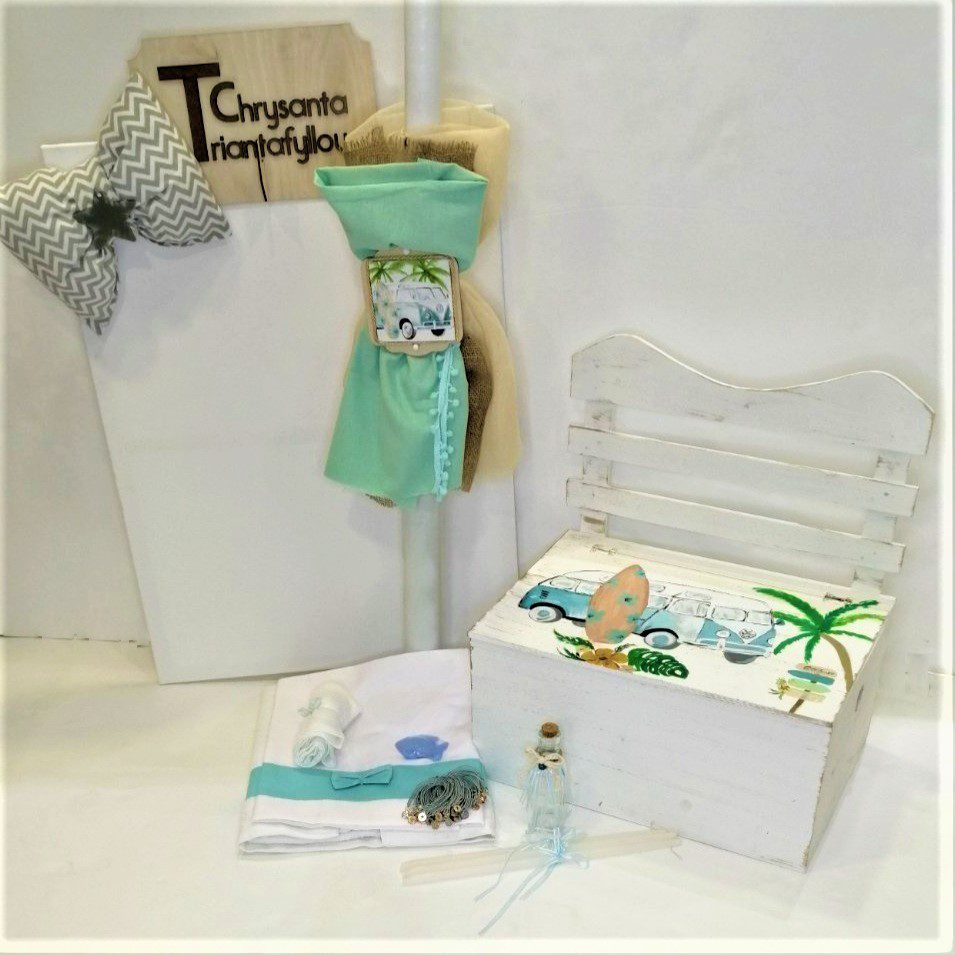 Σετ βάπτισης με παγκάκι και θέμα Vintage Van & Surfing. Το σετ περιλαμβάνει παγκάκι με αποθηκευτικό χώρο, ζωγραφισμένο στο χέρι, στολισμός λαμπάδας με το ίδιο θέμα σε ξύλινο διακοσμητικό (δεν συμπεριλαμβάνεται το κερί), 50 μαρτυρικά, 3 κεράκια, μπουκαλάκι λαδιού, σαπουνάκια, πετσέτες, σετ λαδόπανα και εσώρουχα. Το σετ κουτί βάφτισης είναι χειροποίητο και ζωγραφισμένο στο χέρι και χρειάζεται 10-12 μέρες παράδοσης.