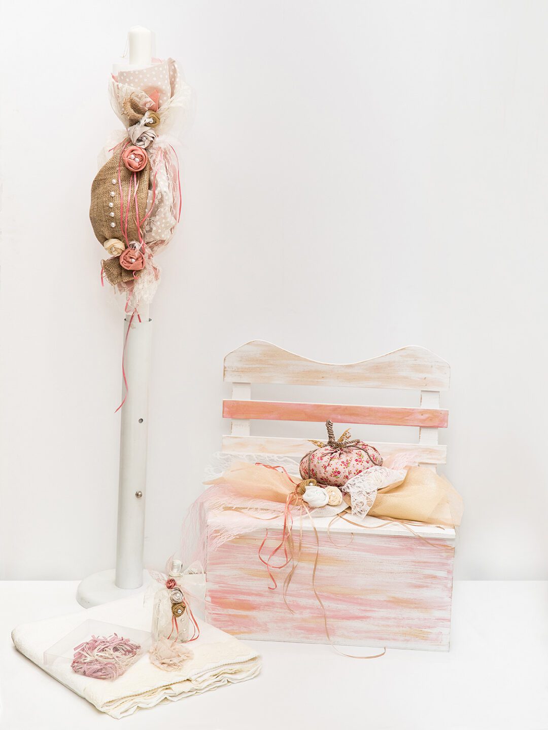 Σετ βάπτισης παγκάκι σε χρώμα off white με θέμα την κολοκύθα, ζωγραφισμένο και διακοσμημένο με κολοκύθα, vintage λουλούδια, λίνατσα, τούλι και κορδέλες. Το σετ περιλαμβάνει στολισμό λαμπάδας (δεν συμπεριλαμβάνεται το κερί), 50 μαρτυρικά, 3 κεράκια, μπουκαλάκι λαδιού, σαπουνάκια, πετσέτες, σετ λαδόπανα και εσώρουχα. Το σετ κουτί βάφτισης είναι χειροποίητο και ζωγραφισμένο στο χέρι και χρειάζεται 10-12 μέρες παράδοσης.
