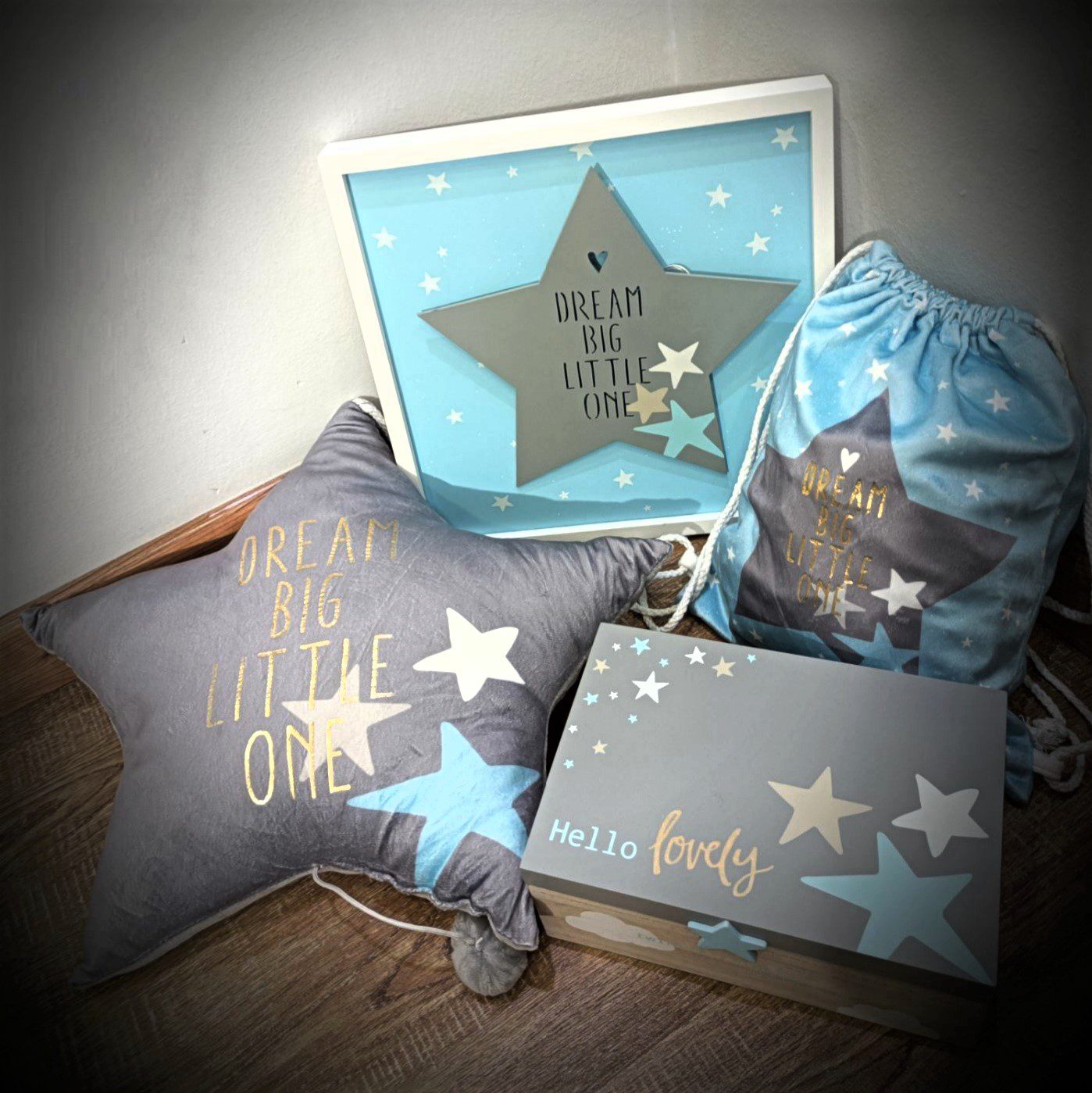 Σετ για αγόρι Dream Big Little one, ιδανικό για δώρο! Το σετ περιλαμβάνει μαξιλαράκι, καδράκι, τσάντα και αποθηκευτικό κουτί