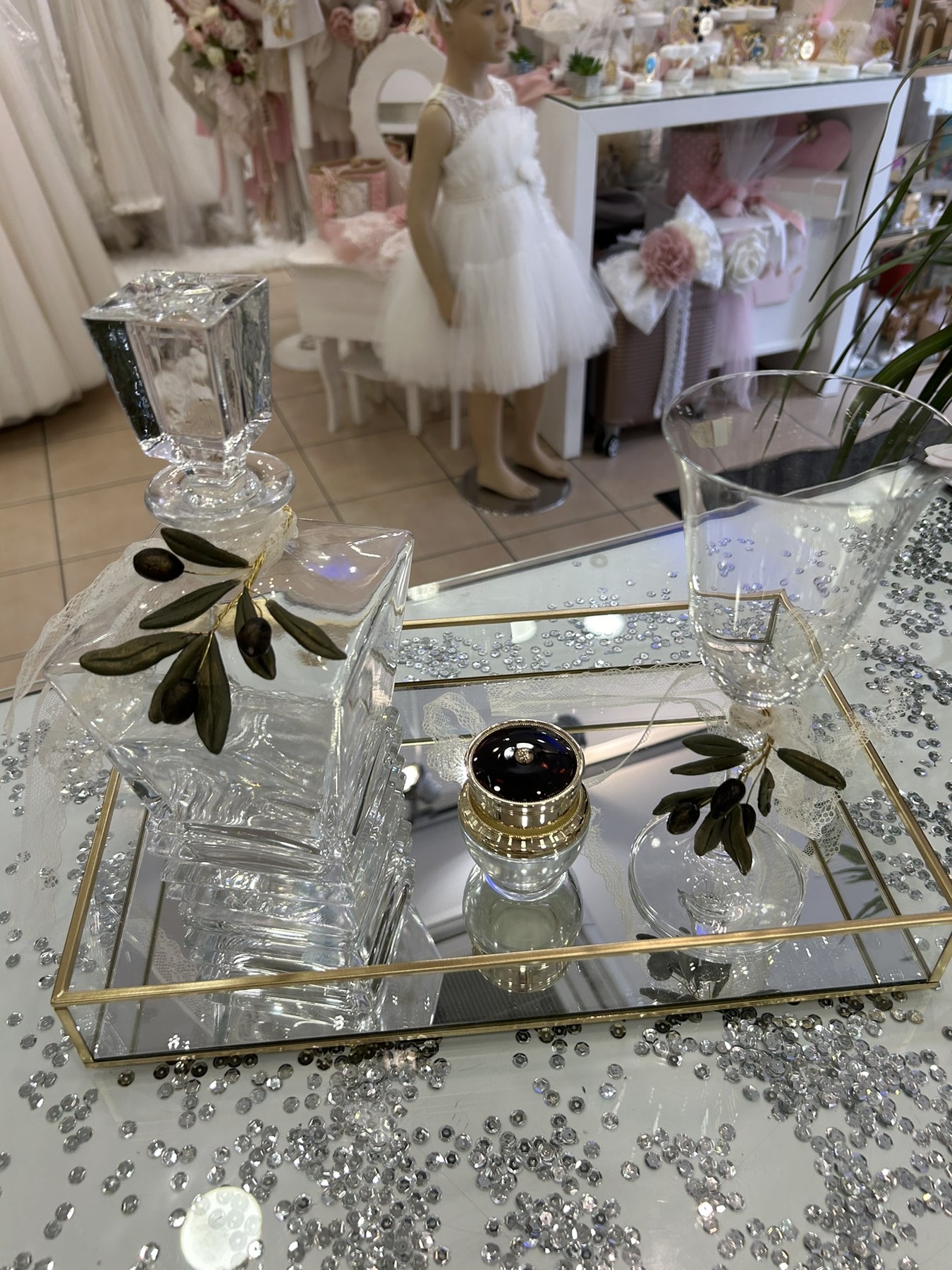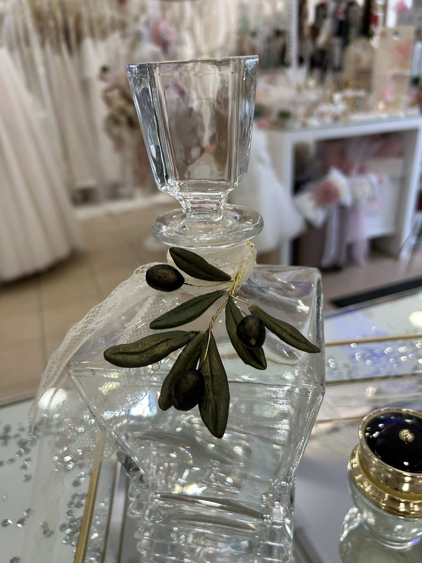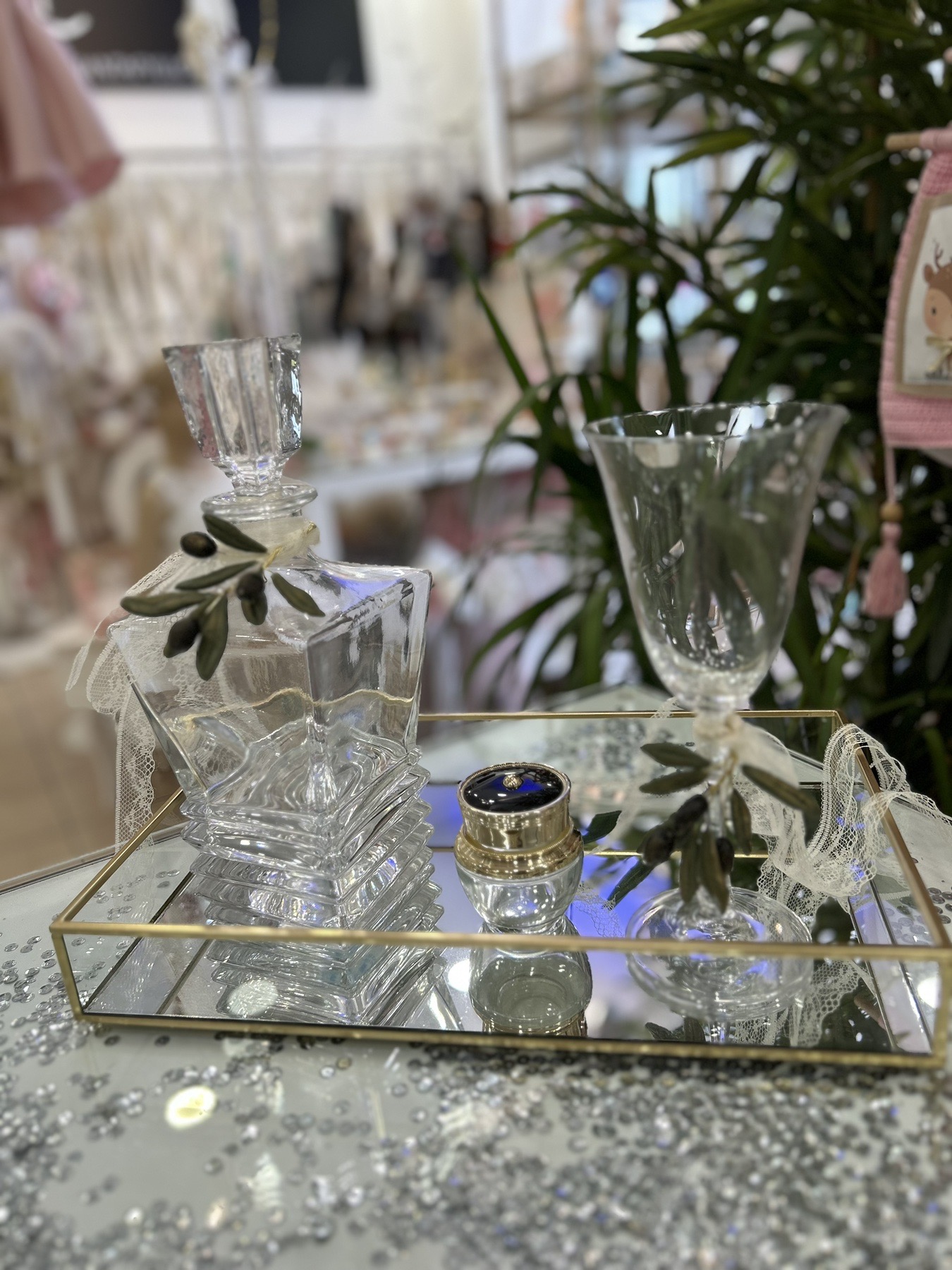 Σετ κουμπάρου από κρύσταλλο Βοημίας διακοσμημένο με χειροποίητη ελιά. Το σετ περιλαμβάνει περίτεχνο επίχρυσο δίσκο, ιδιαίτερη μποτίλια κρασιού και ένα ποτήρι από κρύσταλλο Βοημίας. Όλα είναι χειροποίητα και κατασκευασμένα στην Ελλάδα.
