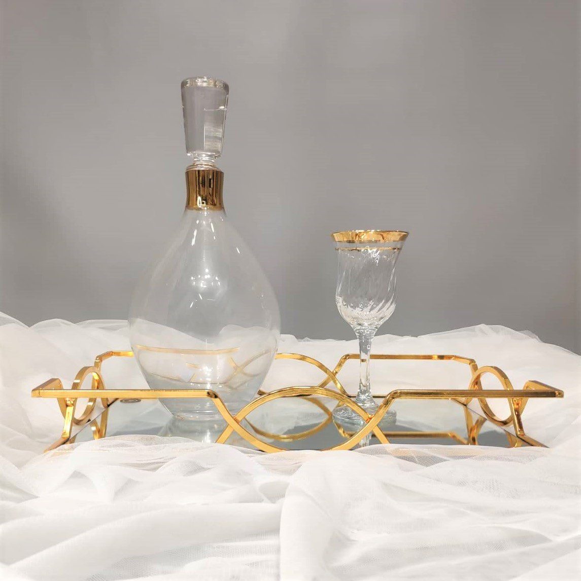 Σετ κουμπάρου από κρύσταλλο Βοημίας με επίχρυσες λεπτομέρειες. Το σετ περιλαμβάνει περίτεχνο επίχρυσο δίσκο 40×25 , ιδιαίτερη μποτίλια κρασιού και ποτήρι από κρύσταλλο Βοημίας. Όλα είναι χειροποίητα και κατασκευασμένα στην Ελλάδα.