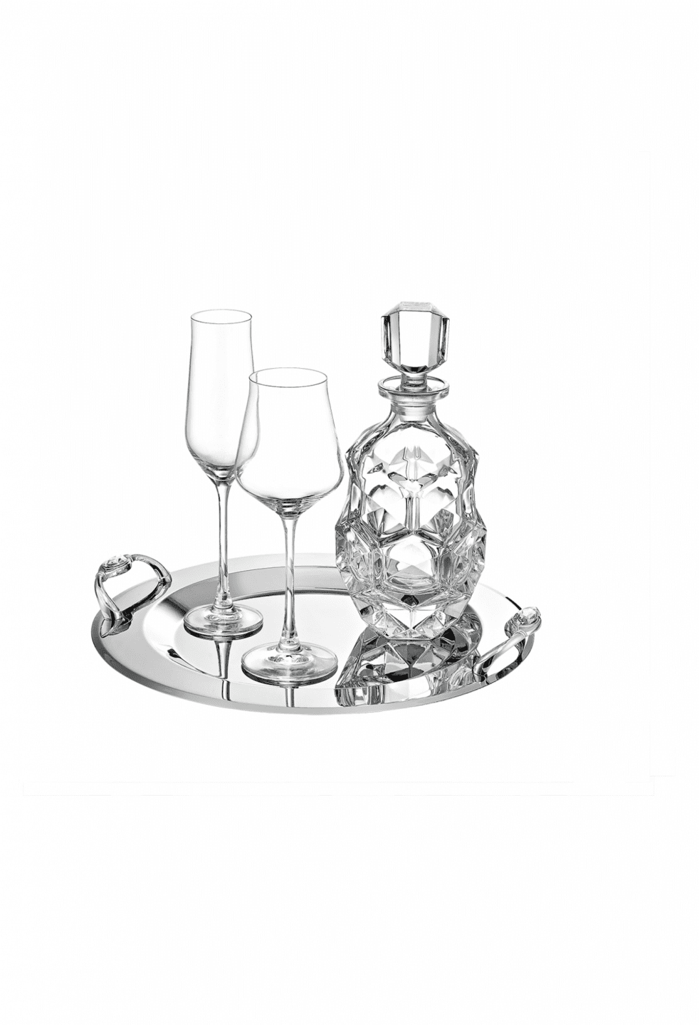 Σετ κουμπάρου από κρύσταλλο Βοημίας με ασημί στολισμό. Το σετ περιλαμβάνει περίτεχνο δίσκο, ιδιαίτερη μποτίλια κρασιού και ένα ποτήρι από κρύσταλλο Βοημίας. Όλα είναι χειροποίητα και κατασκευασμένα στην Ελλάδα.
