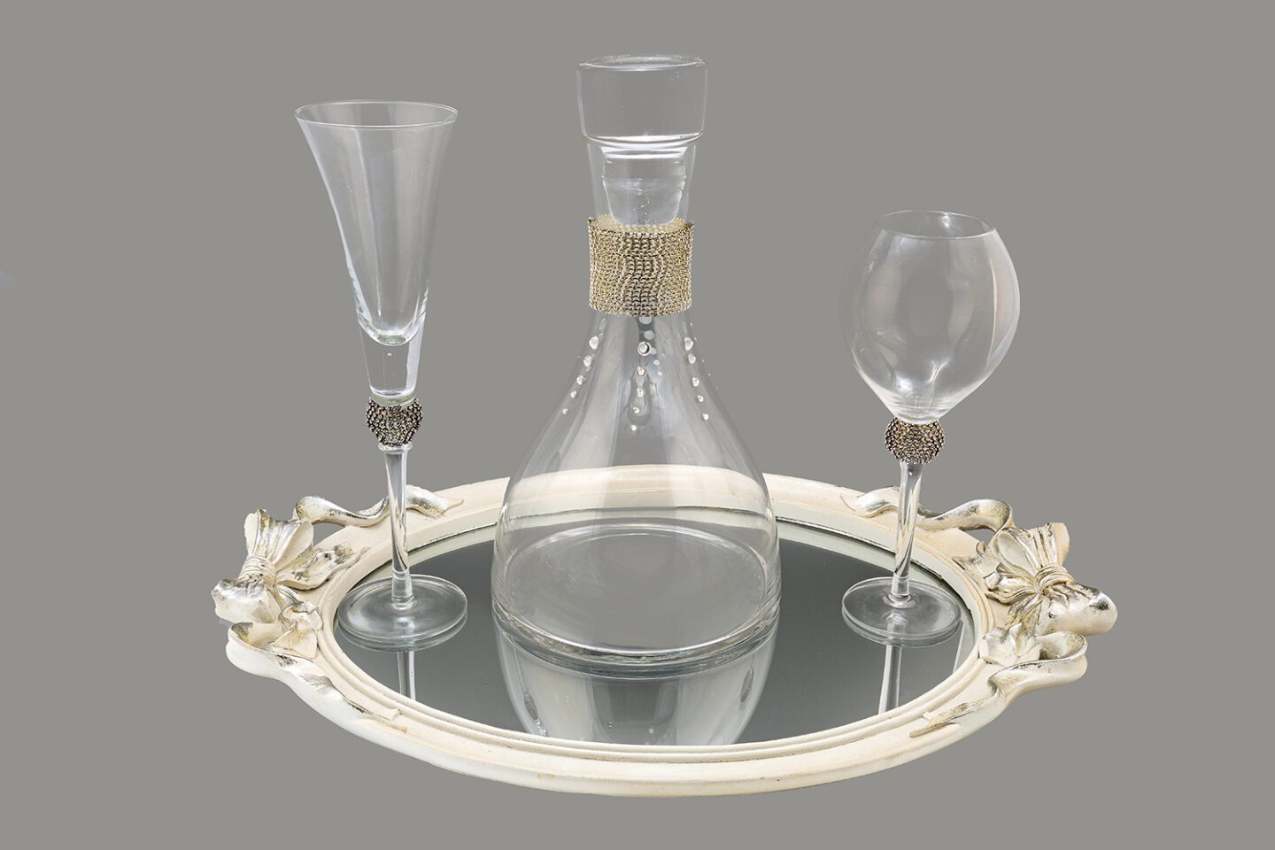 Σετ κουμπάρου από κρύσταλλο Βοημίας με επίχρυσες λεπτομέρειες. Το σετ περιλαμβάνει περίτεχνο επίχρυσο δίσκο καθρέφτη, ιδιαίτερη μποτίλια κρασιού και ένα ποτήρι από κρύσταλλο Βοημίας. Όλα είναι χειροποίητα και κατασκευασμένα στην Ελλάδα.
