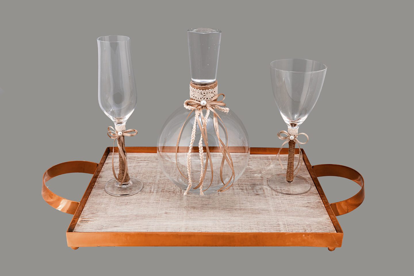 Σετ κουμπάρου από κρύσταλλο Βοημίας με επίχρυσες λεπτομέρειες. Το σετ περιλαμβάνει περίτεχνο επίχρυσο δίσκο, ιδιαίτερη μποτίλια κρασιού και ένα ποτήρι από κρύσταλλο Βοημίας. Όλα είναι χειροποίητα και κατασκευασμένα στην Ελλάδα.