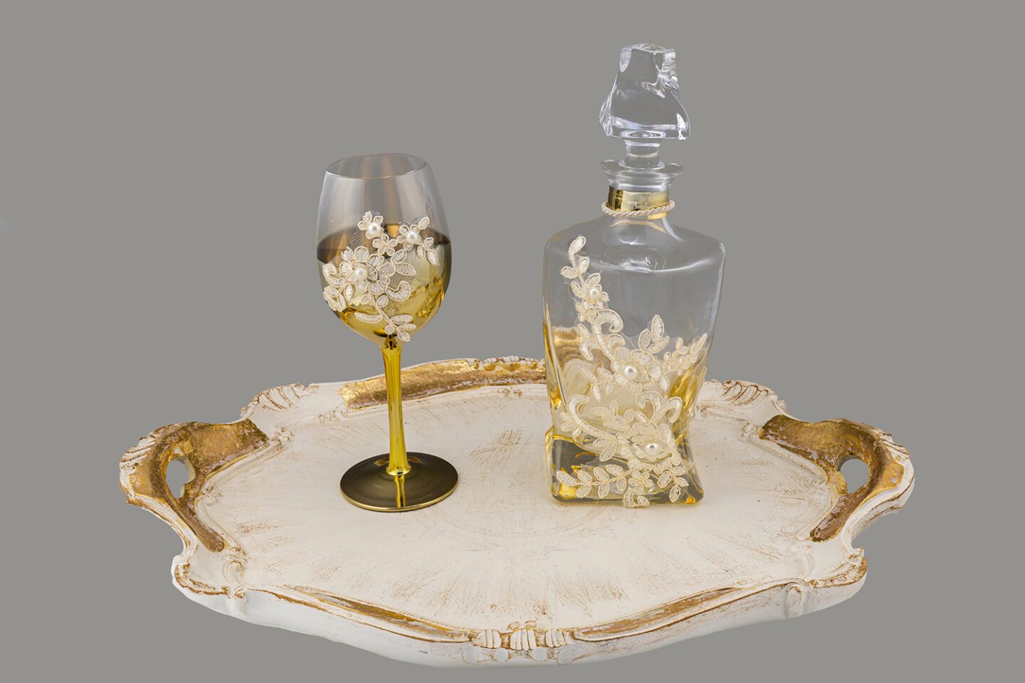 Σετ κουμπάρου από κρύσταλλο Βοημίας με επίχρυσες λεπτομέρειες. Το σετ περιλαμβάνει περίτεχνο επίχρυσο δίσκο, ιδιαίτερη μποτίλια κρασιού και ένα ποτήρι από κρύσταλλο Βοημίας. Όλα είναι χειροποίητα και κατασκευασμένα στην Ελλάδα.