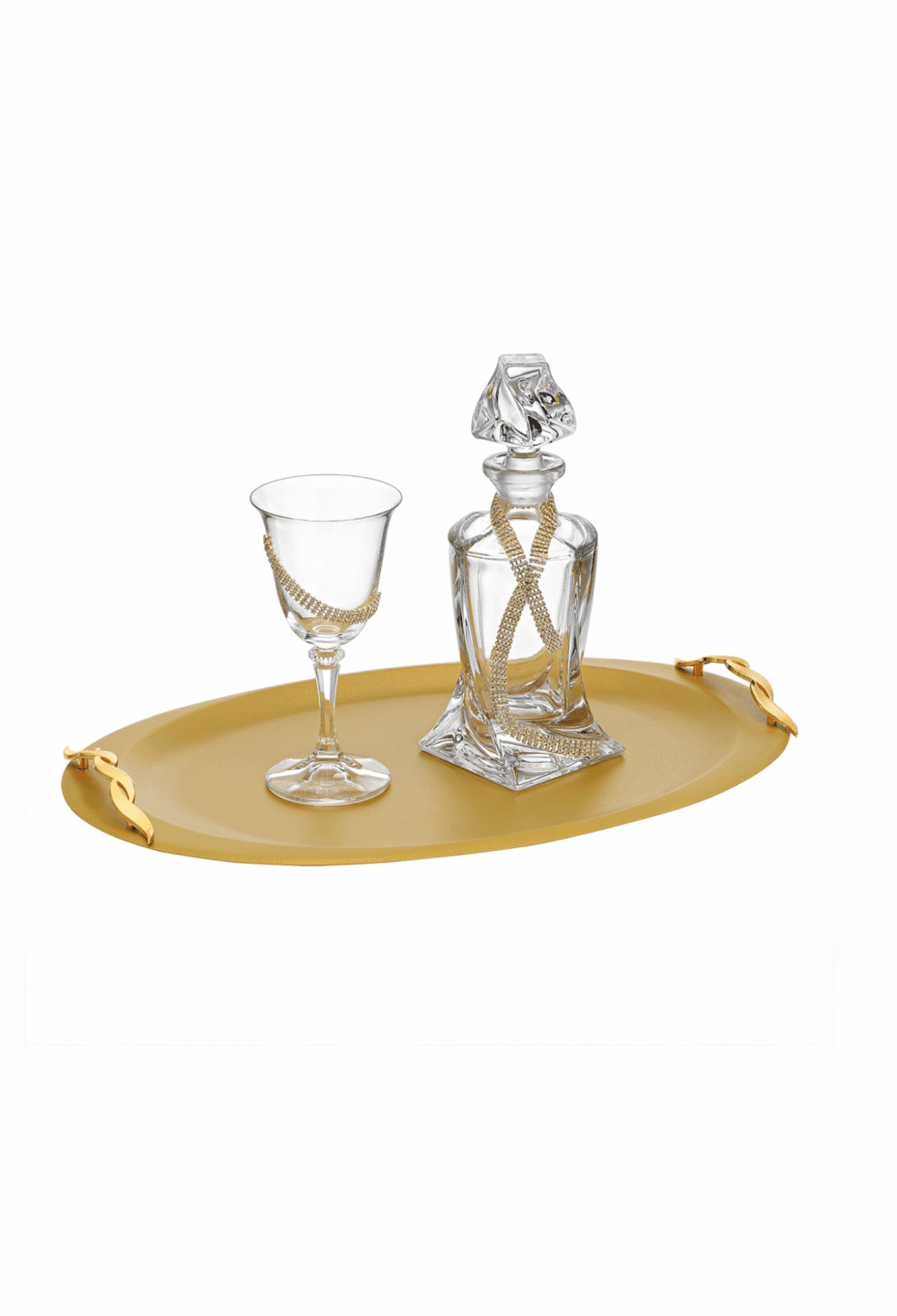 Σετ κουμπάρου από κρύσταλλο Βοημίας με επίχρυσες λεπτομέρειες. Το σετ περιλαμβάνει περίτεχνο επίχρυσο δίσκο, ιδιαίτερη μποτίλια κρασιού και ένα ποτήρι από κρύσταλλο Βοημίας. Όλα είναι χειροποίητα και κατασκευασμένα στην Ελλάδα.