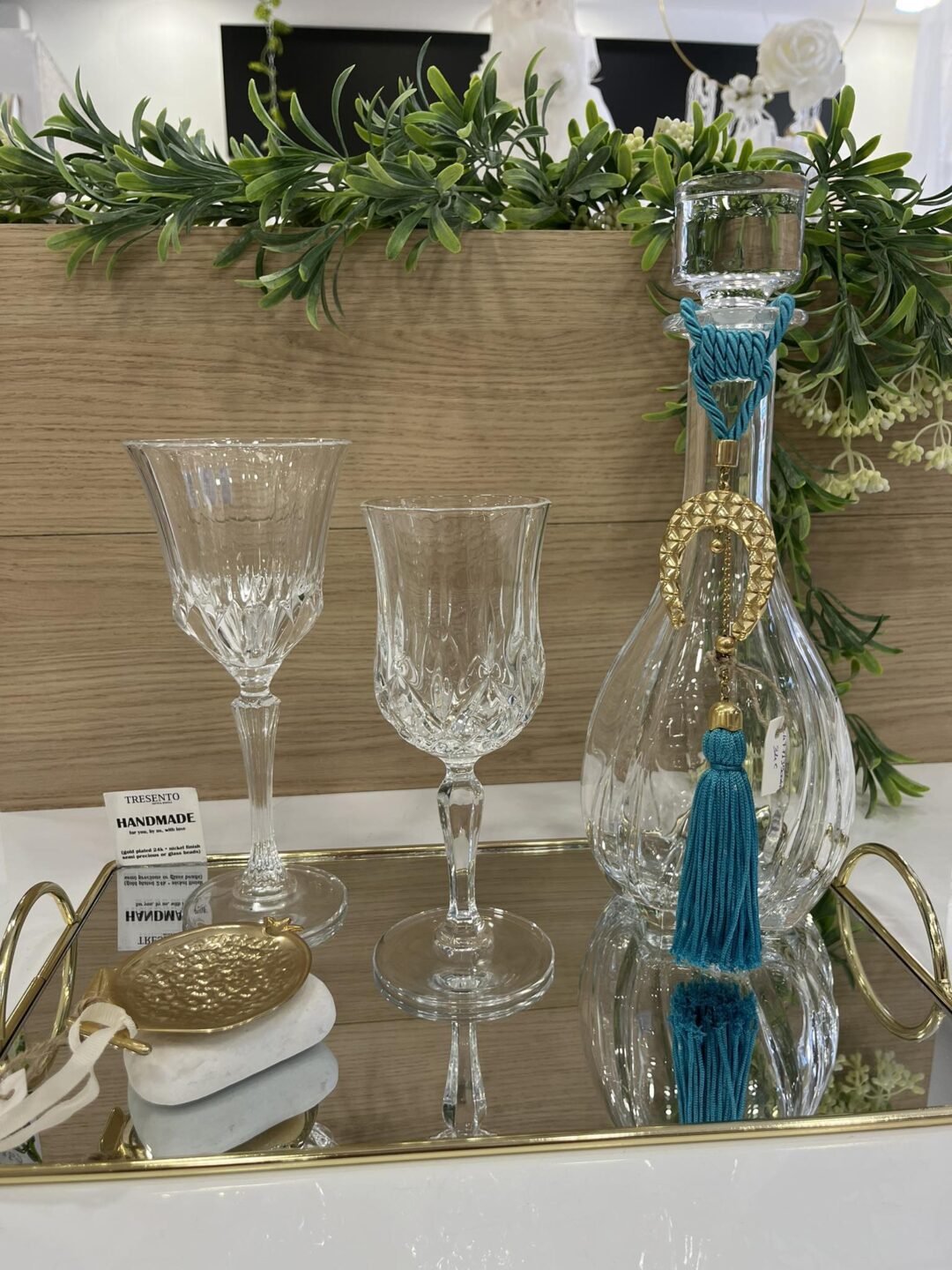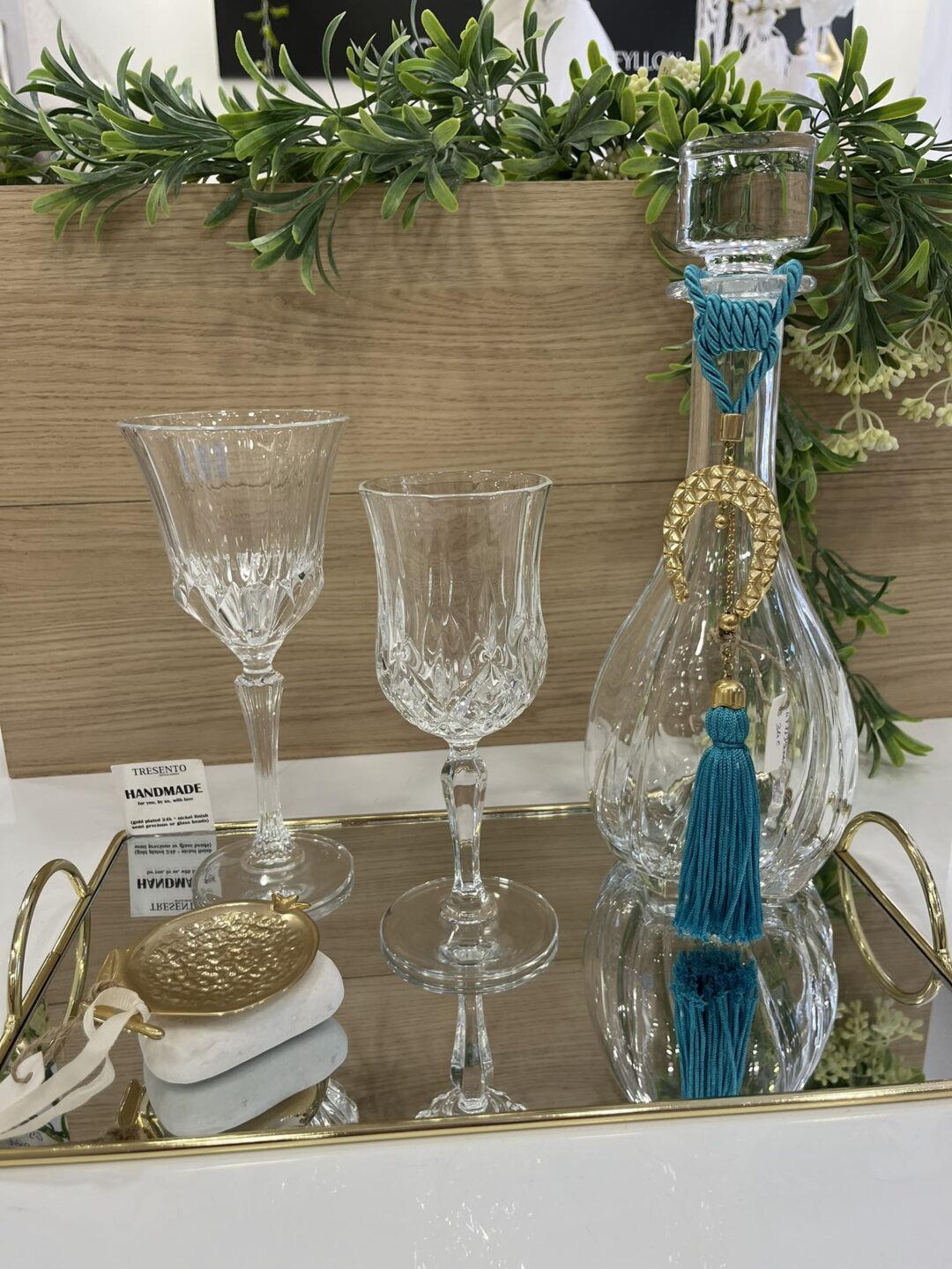 Σετ κουμπάρου από κρύσταλλο Βοημίας με επίχρυσες λεπτομέρειες. Το σετ περιλαμβάνει περίτεχνο επίχρυσο δίσκο καθρέφτη, ιδιαίτερη μποτίλια κρασιού και ένα ποτήρι από κρύσταλλο Βοημίας. Όλα είναι χειροποίητα και κατασκευασμένα στην Ελλάδα.