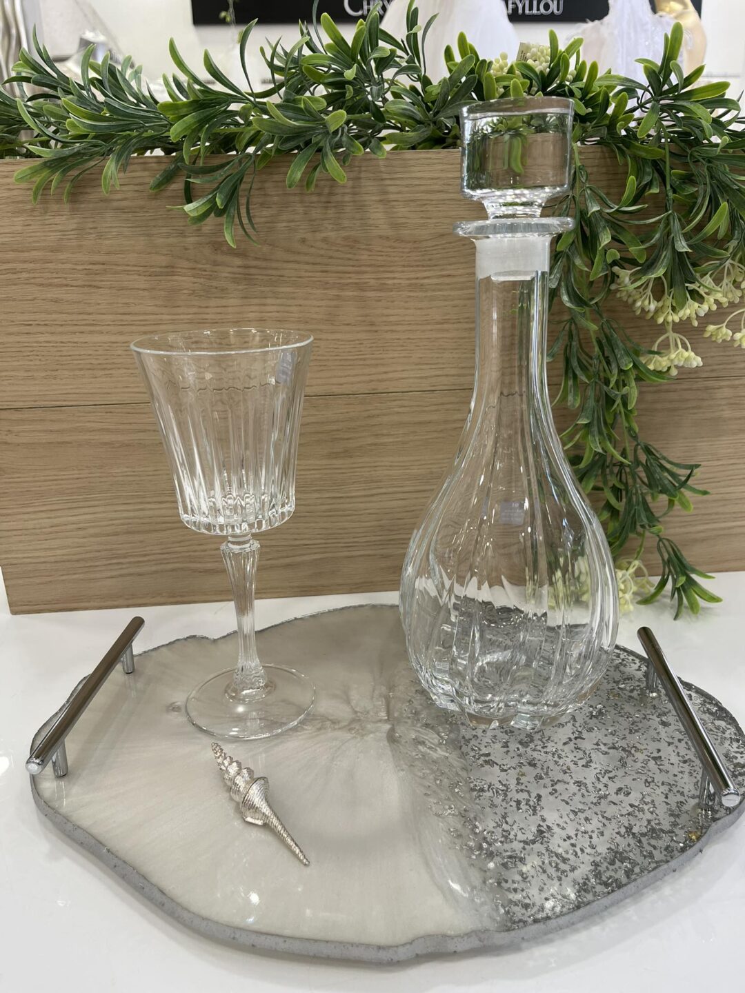 Σετ κουμπάρου από κρύσταλλο Βοημίας με υγρό γυαλί. Το σετ περιλαμβάνει περίτεχνο δίσκο απο υγρό γυαλί , ιδιαίτερη μποτίλια κρασιού και ένα ποτήρι από κρύσταλλο Βοημίας. Όλα είναι χειροποίητα και κατασκευασμένα στην Ελλάδα.