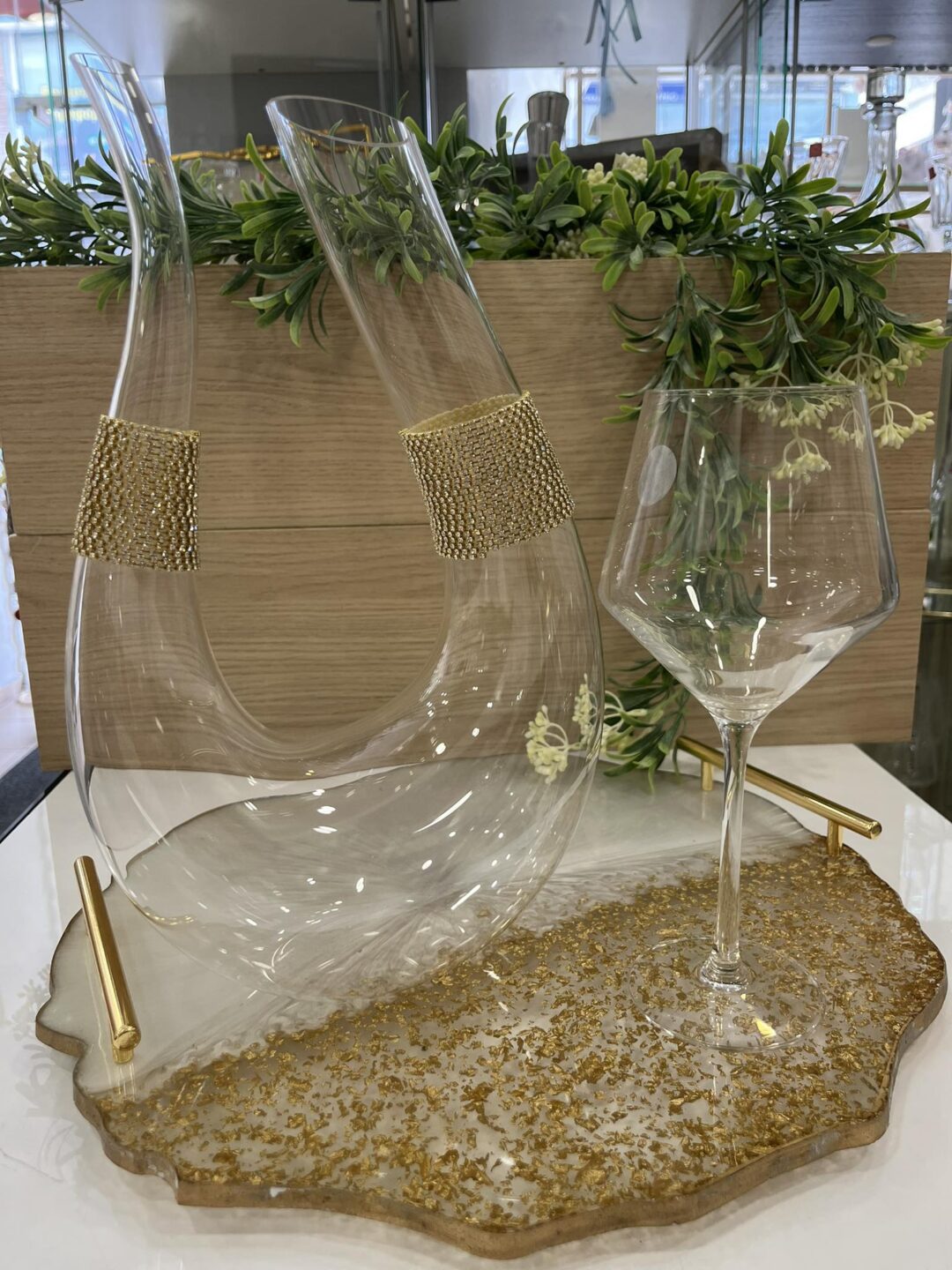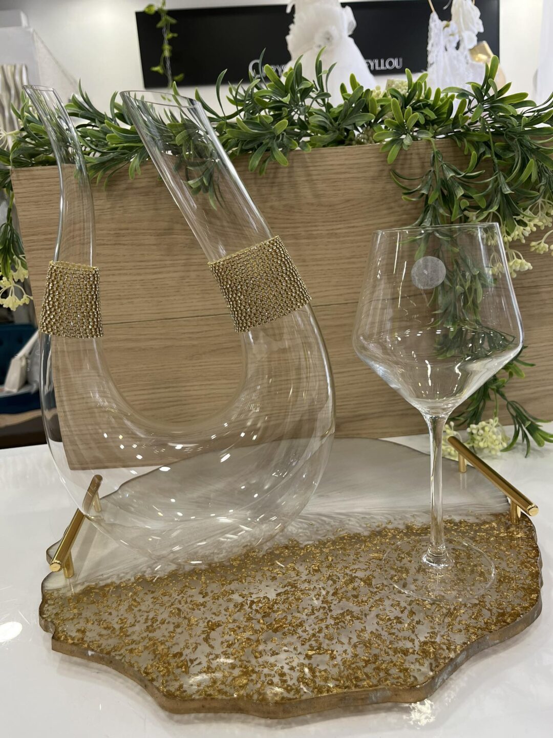 Σετ κουμπάρου από κρύσταλλο Βοημίας με υγρό γυαλί. Το σετ περιλαμβάνει περίτεχνο δίσκο απο υγρό γυαλί , ιδιαίτερη μποτίλια κρασιού και ένα ποτήρι από κρύσταλλο Βοημίας. Όλα είναι χειροποίητα και κατασκευασμένα στην Ελλάδα.