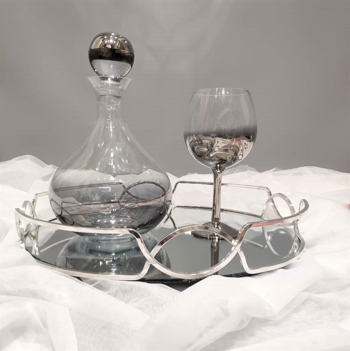 Σετ κουμπάρου σε κρύσταλλο Βοημίας με degrade εφέ σε γκρι ασημί. Το σετ περιλαμβάνει περίτεχνο δίσκο 40×25, ιδιαίτερη μποτίλια κρασιού και ποτήρι από κρύσταλλο Βοημίας. Όλα είναι χειροποίητα και κατασκευασμένα στην Ελλάδα.