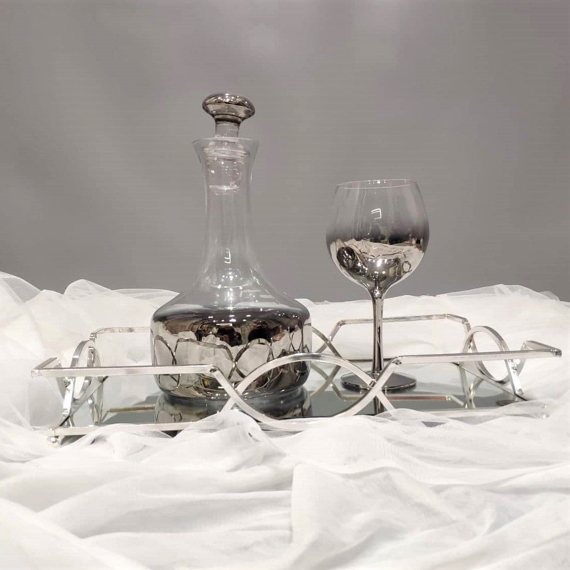 • Σετ κουμπάρου σε κρύσταλλο Βοημίας με degrade εφέ σε γκρι ασημί. Το σετ περιλαμβάνει περίτεχνο δίσκο 40x25, ιδιαίτερη μποτίλια κρασιού και ποτήρι από κρύσταλλο Βοημίας