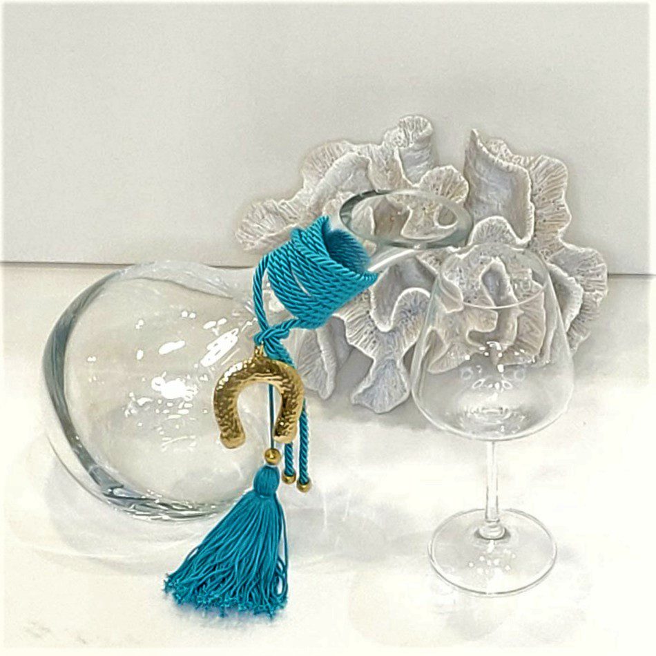 Το σετ περιλαμβάνει ιδιαίτερη μποτίλια κρασιού και ποτήρι από κρύσταλλο Βοημίας, διακοσμημένο με επιχρυσωμένο 24 καρατίων στολίδι Tresento, με χρυσό πέταλο, μπλε φούντα και μεταξωτό κορδόνι. Όλα είναι χειροποίητα και κατασκευασμένα στην Ελλάδα.