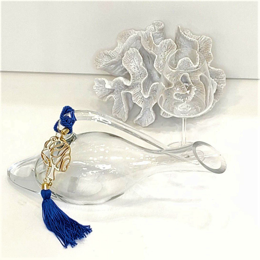 Το σετ περιλαμβάνει ιδιαίτερη μποτίλια κρασιού και ποτήρι από κρύσταλλο Βοημίας, διακοσμημένο με επιχρυσωμένο 24 καρατίων στολίδι Tresento, με διάτρητο Δέντρο της ζωής, μπλε φούντα και μεταξωτό κορδόνι. Όλα είναι χειροποίητα και κατασκευασμένα στην Ελλάδα.