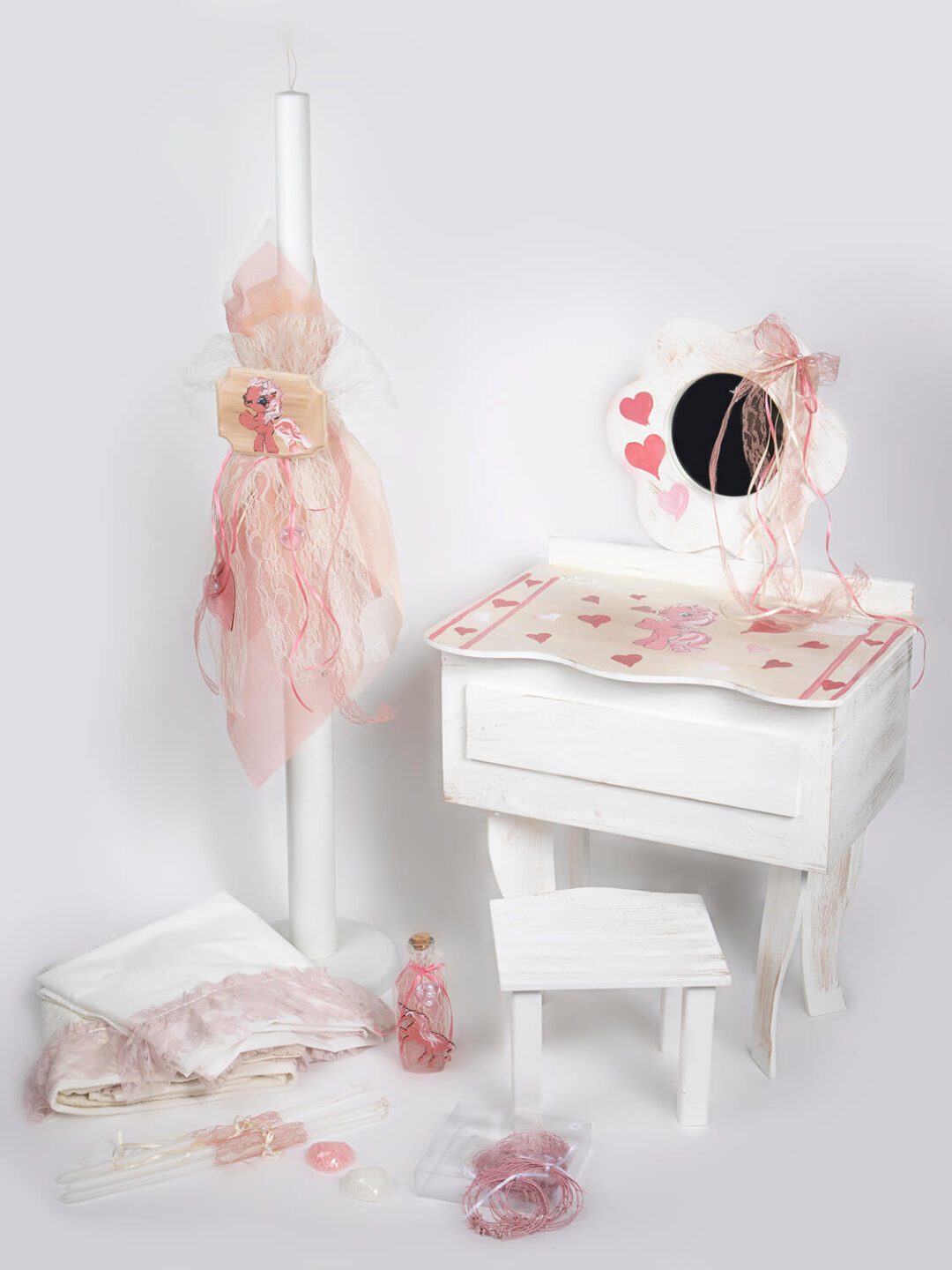 Σετ κουτί βάπτισης για κορίτσι, boudoir off white αντικιέ, με αποσπώμενο καθρεφτη, συνοδευόμενο από σκαμπώ, με θέμα το μικρό μου πόνυ. Στολισμένο με ξύλινο καντράκι πόνυ ζωγραφισμένη στο χέρι* και δέσιμο με ροζ τούλια και δαντέλες. Το σετ περιλαμβάνει στολισμό λαμπάδας (δεν συμπεριλαμβάνεται το κερί), 50 μαρτυρικά, 3 κεράκια, μπουκάλι λαδιού, σαπουνάκι, πετσέτες, σετ λαδόπανα και εσώρουχα. *Tο σετ βάπτισης είναι χειροποίητο και χρειάζεται 10-12 ημέρες παράδοσης.