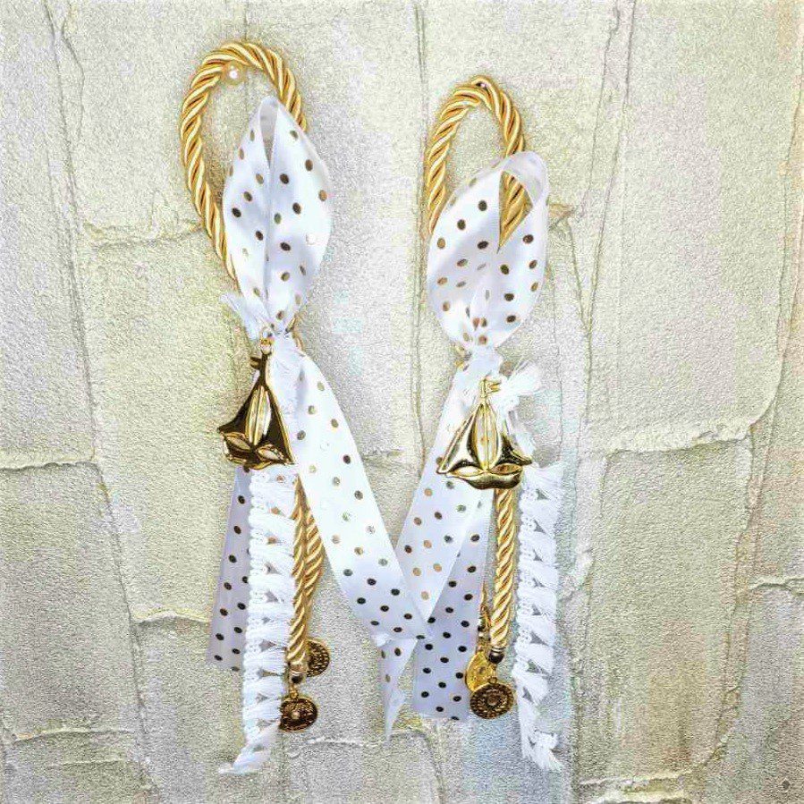 Σετ 2 γούρια 2023 με καραβάκι και χρυσά νομίσματα, επιχρυσωμένο, διακοσμημένο με σατέν κορδόνι και κορδέλες. Ιδανικό δώρο για το σπίτι ή το γραφείο