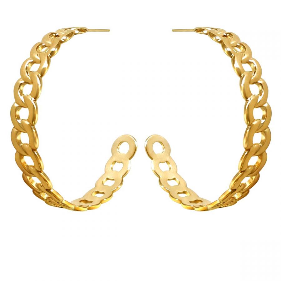 Εξαιρετικοί κρίκοι από ατσάλι με σχέδιο αλυσίδας, σε χρυσό χρώμα. Διάμετρος: 4,5 cm, πλάτος: 8 mm, πάχος: 1 mm. Ελληνικής κατασκευής