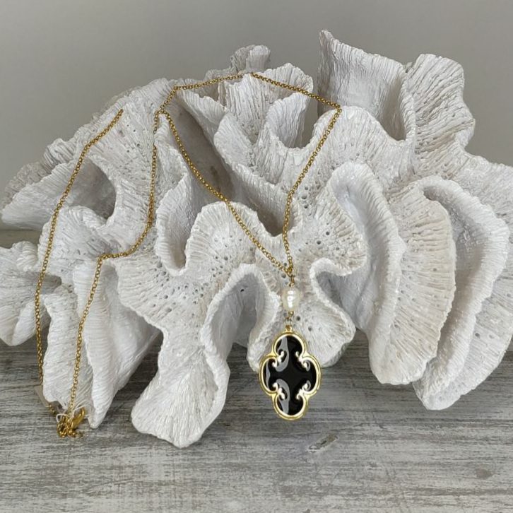 Σταυρός με μαργαριτάρια και μαύρο σταυρό από σμάλτο. Μήκος 39 εκ. στοιχείο 5 εκ. Οι χειροποίητες δημιουργίες του Tresento είναι επιχρυσωμένες με 24 καράτια ή επιροδιωμένες, ενδέχεται να χρειαστούν έως 15 εργάσιμες ημέρες για την κατασκευή τους. Ελληνικής κατασκευής.