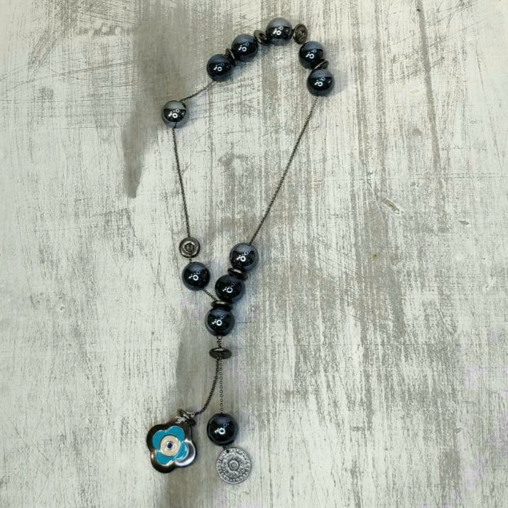Διακοσμητικό κομπολόι με επιροδιωμένο ασήμι και ημιπολύτιμους λίθους αιματίτη. Διακοσμητικό μάτι από γκρι σμάλτο. Μήκος 39 εκ. Ιδανικό δώρο για τον άνδρα! Ο Αιματίτης λέγεται και “πέτρα του μυαλού“, αφού βοηθάει στη συγκέντρωση, εμποδίζει το άγχος, την αμφιβολία και βοηθάει στην αποτοξίνωση.